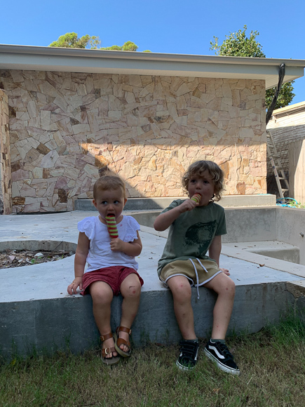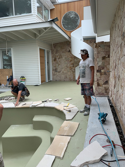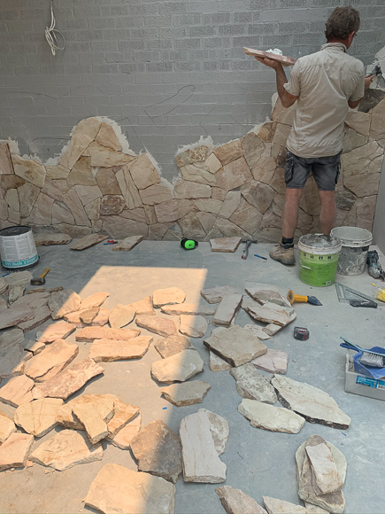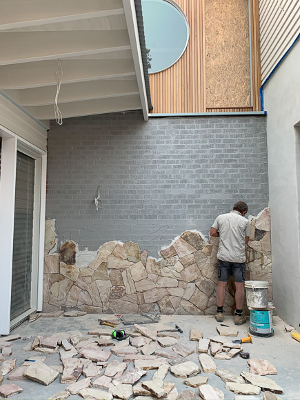 In keeping with our ‘Australian coast meets Mediterranean villa’ feel we’ve selected Santorini wall cladding from Stone Style to break up the James Hardie Linea 150 weatherboards and rendered surfaces. We started this process with Garry (Kyal’s step-dad) who came from South Australia to help us, but we definitely underestimated how long the stone work would take! We ended up also recruiting Marty and Neil from Stone Co Stone Masons to jump on board, and without them I think it would have taken us until Christmas 2020! We’ve chosen to lay in a dry stack with no grout so the process is time consuming.