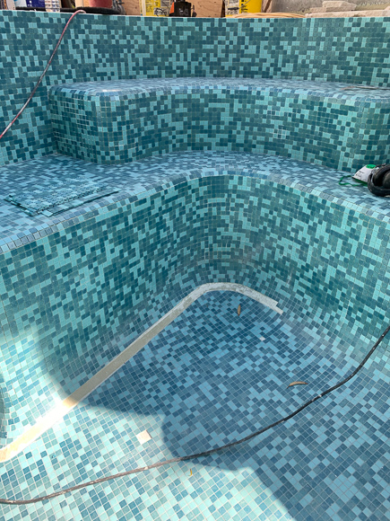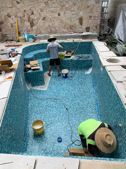 I’ve chosen a turquoise tile called ‘Mos Splash’ from Beaumont Tiles, which is a lot brighter than the muted, sandy colour palette of the rest of the exterior but will make the water a really beautiful tone. The boys at DTR Tiling have done the most amazing job – the craftsmanship of getting those mosaics to flow seamlessly around the curved and rolled edges finishes the interior of the pool off perfectly.