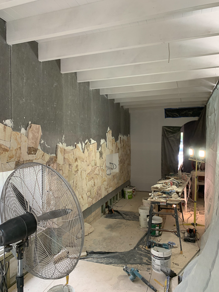 We have had our trusty painters spray the ceiling with Taubmans 3-in-1 Prep, followed by Taubmans Endure One Coat Ceiling. With this done, it’s time for the feature stone wall! As per the outside, we’re using Santorini Random Sandstone 30mm thick wall cladding, sourced through Stone Style. The guys from Stone Co Stone Masons have laid in a ‘dry lay’ stack without grout – again in keeping with the external finishes.