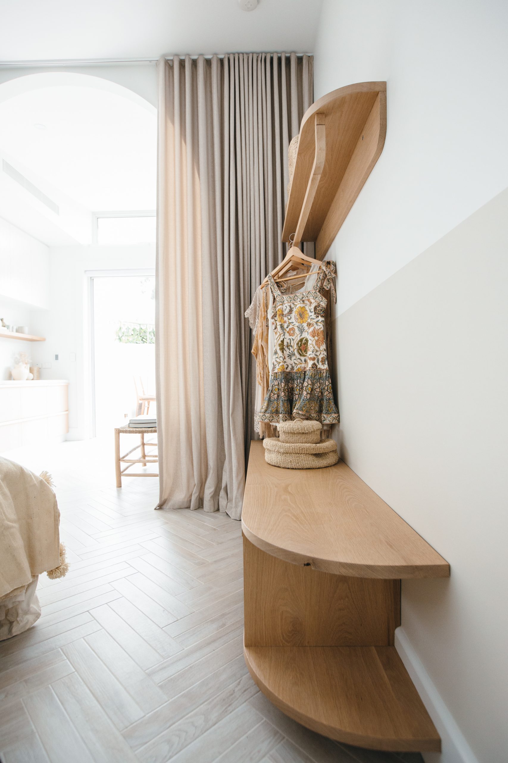 When designing the guest house, we wanted to create a sleeping zone without completely closing off the bedroom with a wall. The arch doorway was something we created ‘on the fly’ and is now one of my favourite features in the studio – especially with the floor to ceiling curtains which provide drama and a sense of luxury. With ‘short stays’ in mind we have some custom Loughlin Furniture cabinetry with just the right amount of storage for a guest. Investing in a comfortable mattress and bedding was also a priority for us in the room. All the details are listed below.