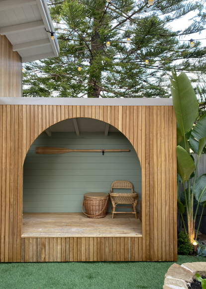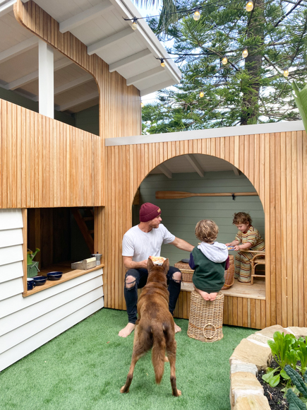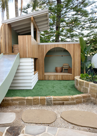 Similar to our cubby house build at Toowoon Bay Beach House we couldn’t find a slide that wasn’t plastic so Kyal has made his own using sheet metal and marine-grade ply. We sourced the sandstone for the vegetable garden and retaining wall from a local quarry at Mangrove Mountain with the help of Stone Co Stone Masons and the sandstone steppers were left over material from the main house pathways.