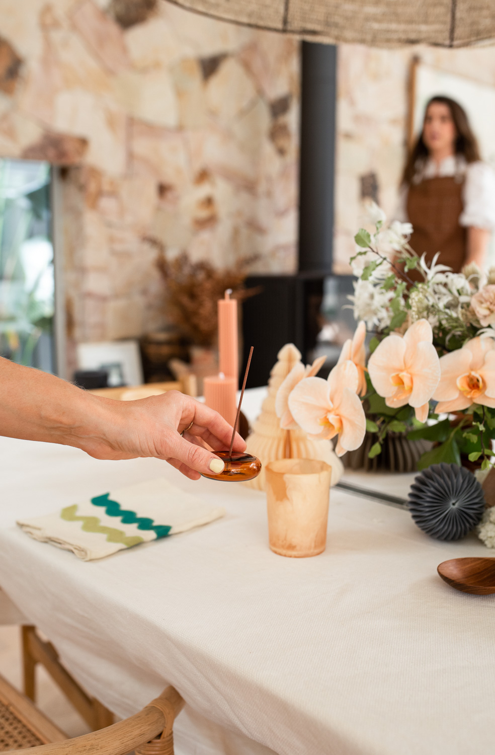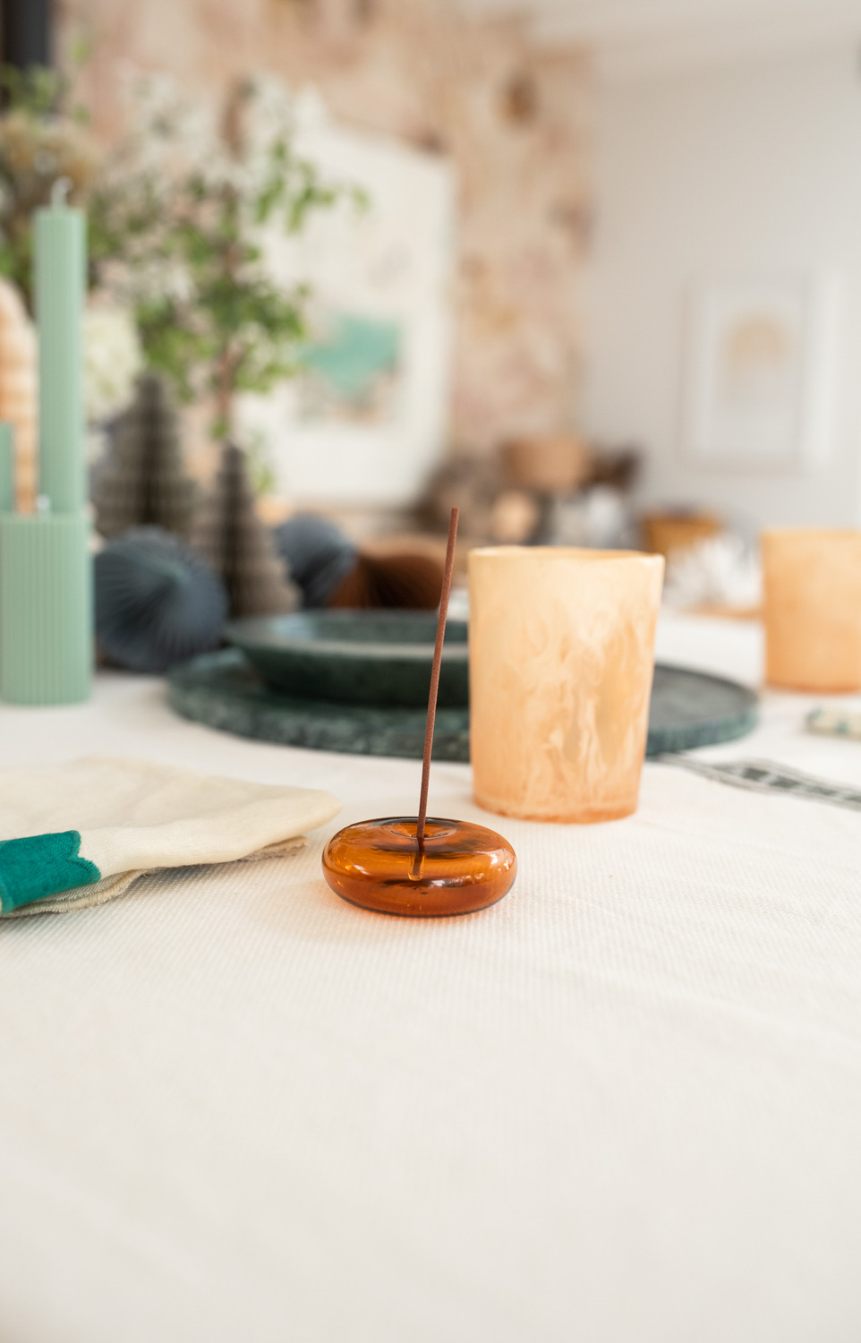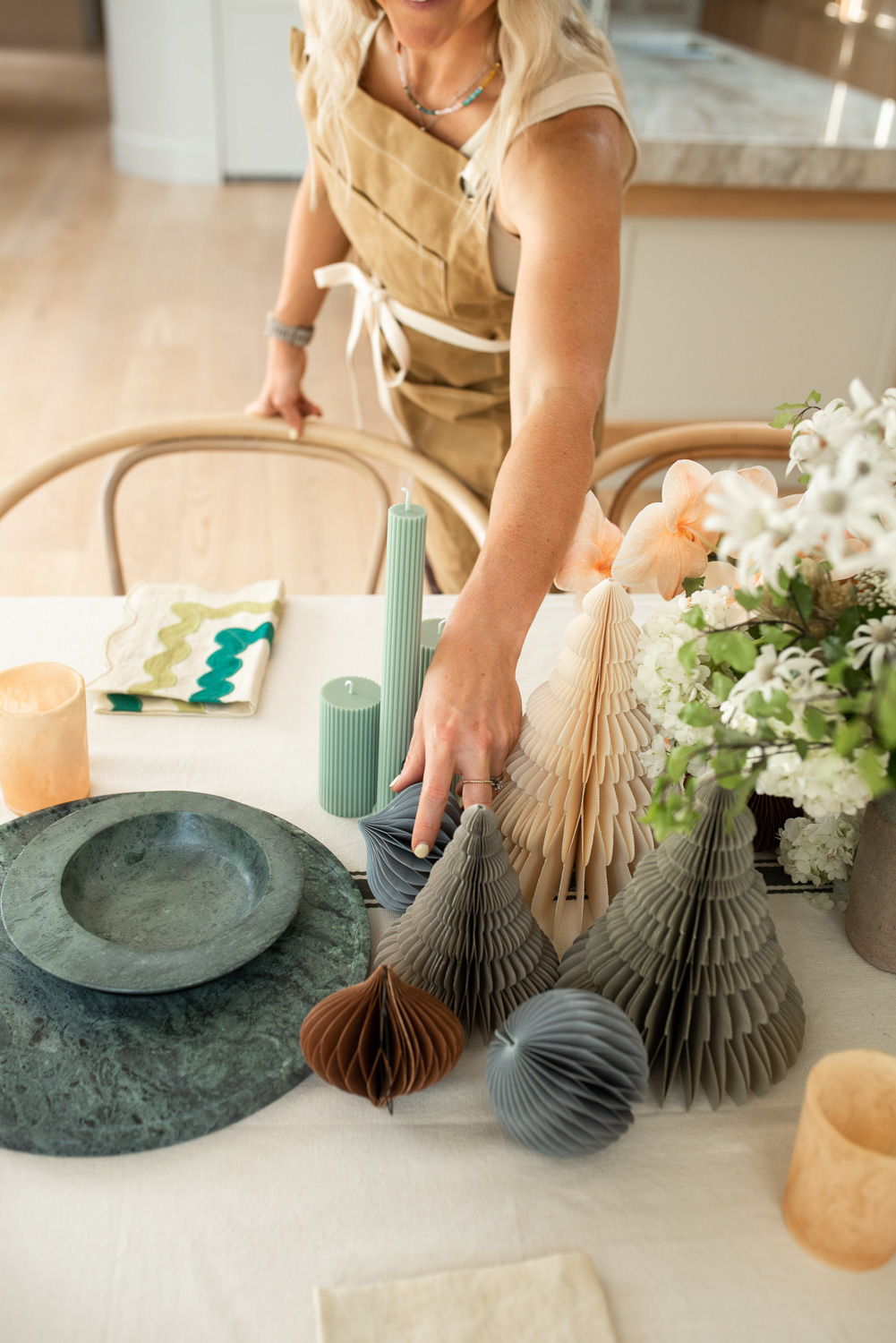 Grateful Tablecloth, Christmas Paper Ornaments and Standing Trees, Axis Marble Bowl & Platter Set, Earl Vessel in Creme Brulee (also available in Matcha), Marble Serving Bowl, Eka Teak Footed Tray (more stock available soon), Ryde Scallop Napkin Set, Tio Teak Serving Spoon, Pillar Candle Collection in Sepia and Sage Green, Glass Vessel Incense Holder in Amber (also available in Pink), Small Clay Beads, Incense.
