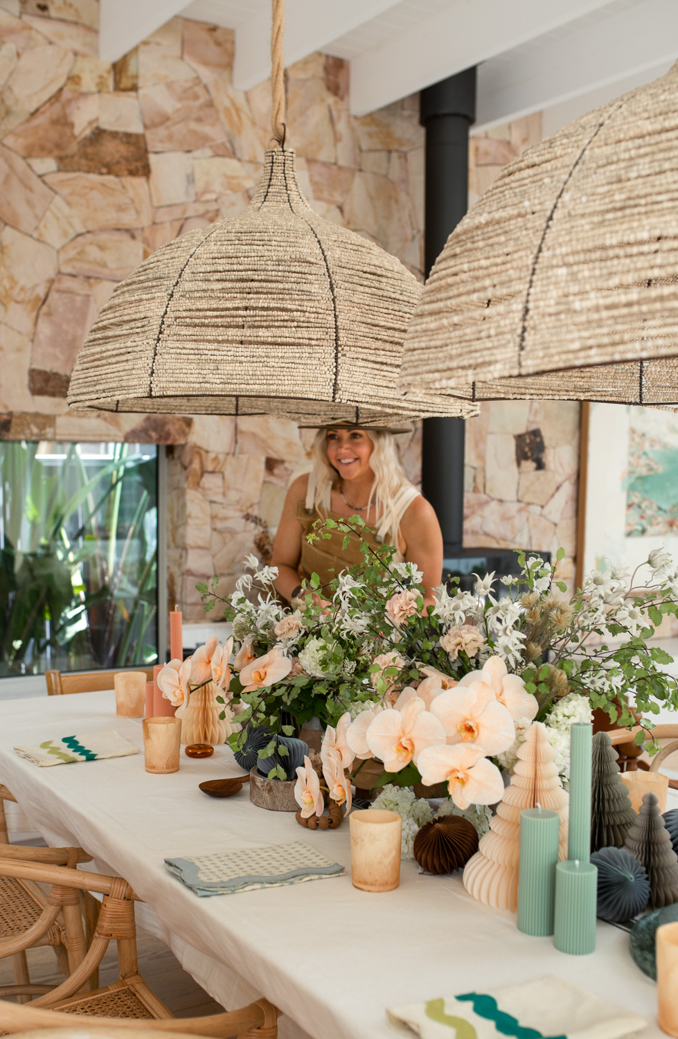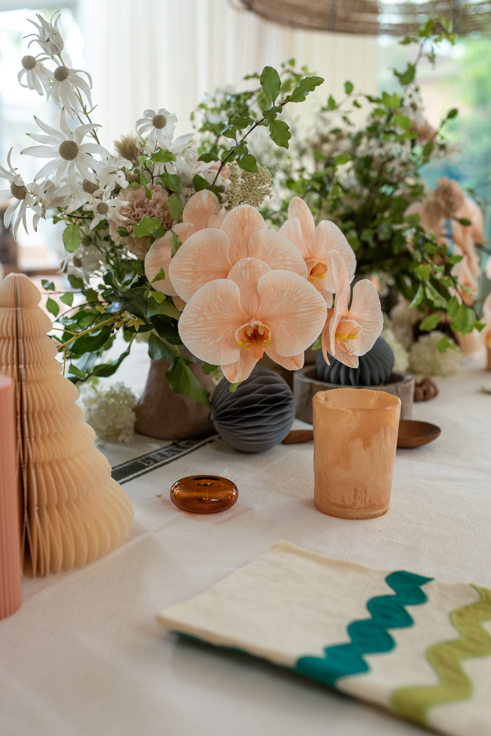 We’ve used our paper ornaments both on and off the tree, together with our standing paper trees, clay beads, stone bowls, timber pieces, delicate blown glass incense holders, all atop some classic linen.