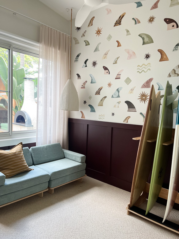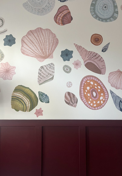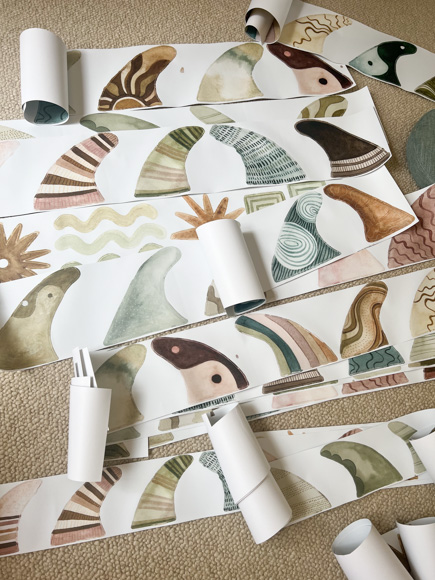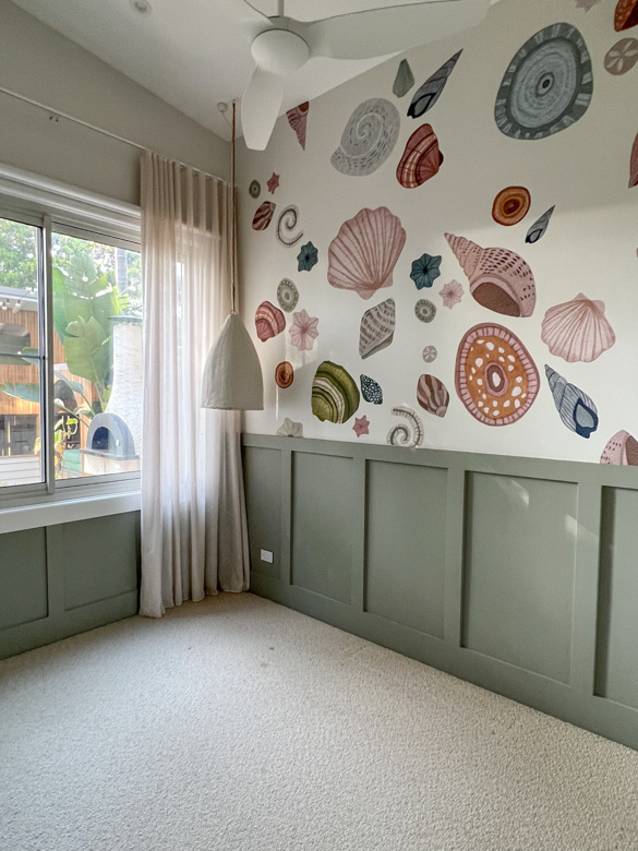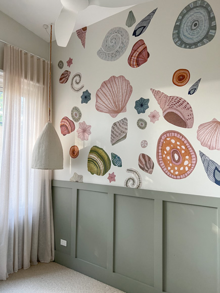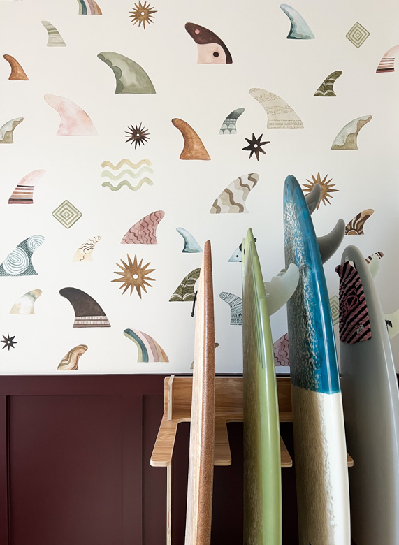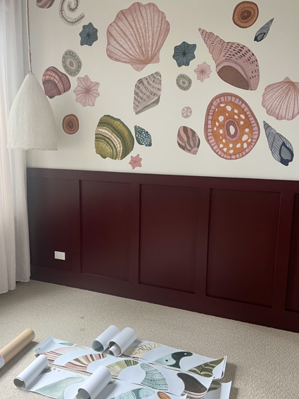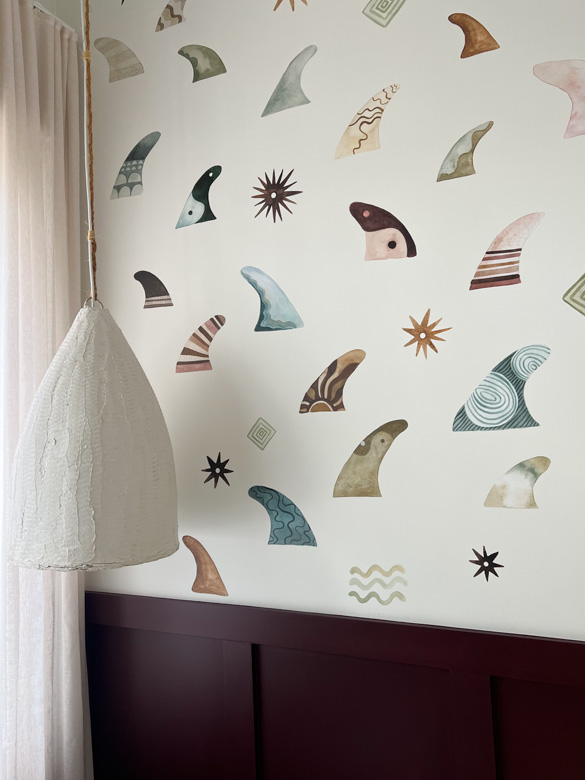 Turns out the colour worked so well with the existing wall stickers (Seashell Wall Stickers collaboration with Farrah’s Stone) and I must admit that I was very reluctant to change them for that reason! A credit to the product, after three years the seashell stickers came off so easily, leaving no marks or residue on the wall, and we re-stuck them on some baking paper to use elsewhere. As soon as the fin stickers began going up I was in LOVE. I’m so happy with how ‘Papatūānuku’ works with the fin colours, and feel it really plays on the browns and maroons. It also inspired me to create a room that plays on the blues of the fins, but that’s a job for another day!