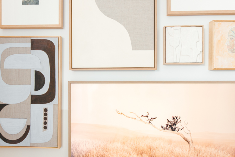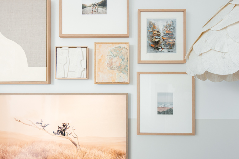 Art doesn’t have to be expensive, there are so many ways to bring gallery to life without breaking the bank. I have some vintage pieces, some small oil paintings from a local artist and even a beautiful sculptural tiles that’s been framed. We’re using oak frames for a consistent look, but for a more eclectic look you could mix up the frames. I love the idea of creating artwork yourself and as you can see here, I have a couple of pieces that the kids have done. If you’re a after a fun family vibe bring in some colour with the kids handprints and even tea towels that have been framed.