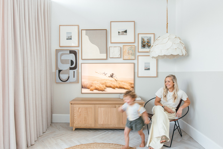 We’re creating this gallery in the lounge area of our studio at Blue Lagoon Build, which is a beautiful light filled space but we’ve always felt it’s missing a touch of personality. The lounge room wall has always bothered us as the existing TV is quite dominant, but with The Frame TV from Samsung, that’s exactly what we want so our beautiful family photo becomes the focal point. When not in use, the TV is transformed into a work of art.