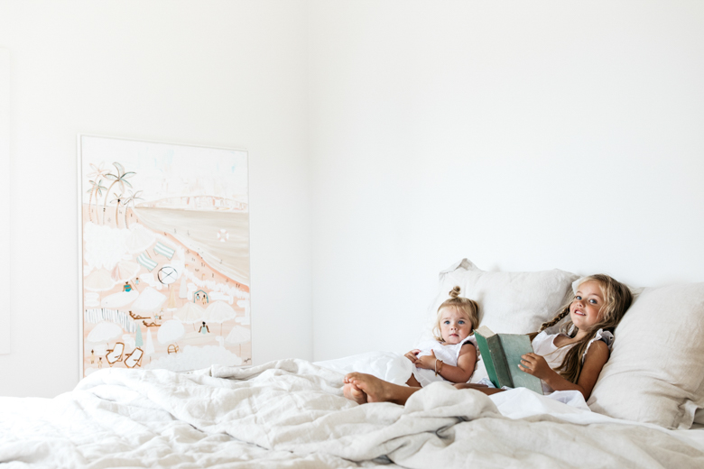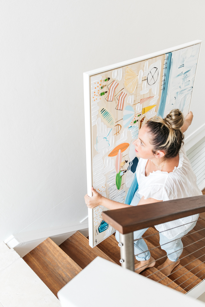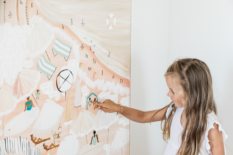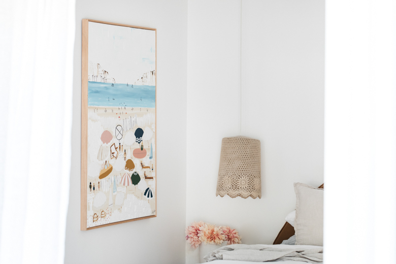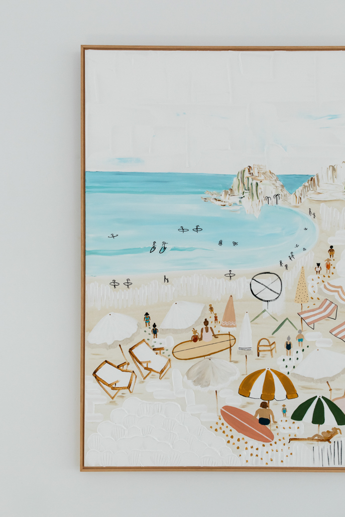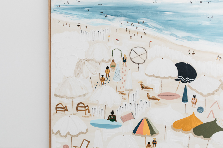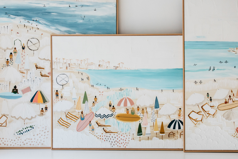We are lucky enough to live in an incredible part of the world. The Australian coastline is ever changing, and never ceases to amaze me. I don’t know about you but I instantly feel calm and happy when I see the ocean – and this is the same feeling I hope to evoke when painting each piece. I draw so much inspiration from our beautiful beaches – from the tasseled umbrellas and striped lounge chairs to the patterns made by shells and footsteps in the sand. I hope to make people smile when they wake up in the morning and see a happy, sunny scene in their space.