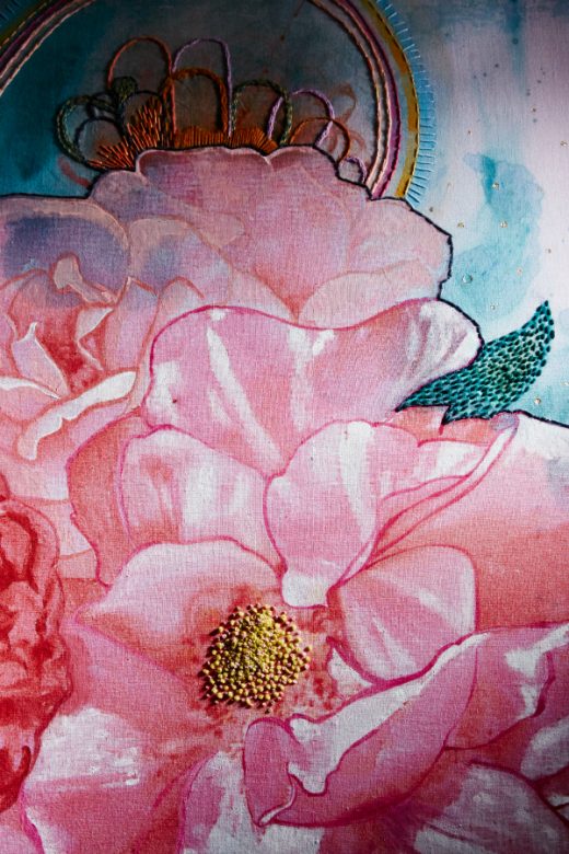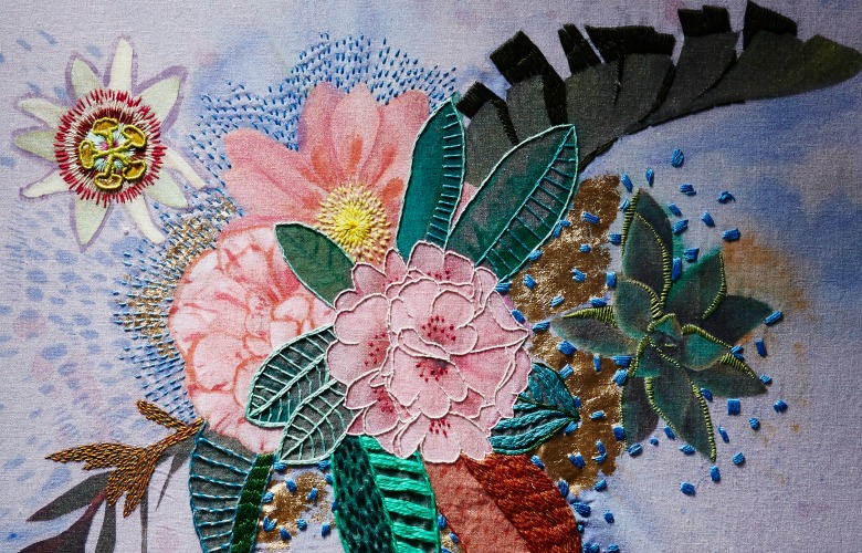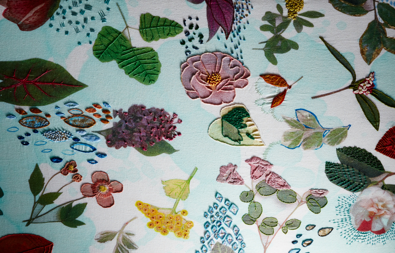 Fleur Woods’ floral work is strikingly beautiful. The contrast of soft muted colours and deep shades first caught my eye but I realised on closer inspection that it’s the hand stitched details that just make everything pop. I saw Fleur’s print range in person earlier this year, and it’s the sort of work you just want to touch – so layered and intricate. If I were to own any of Fleur Woods’ work, it would be the sort of piece I’d want to pass on to my children in years to come.