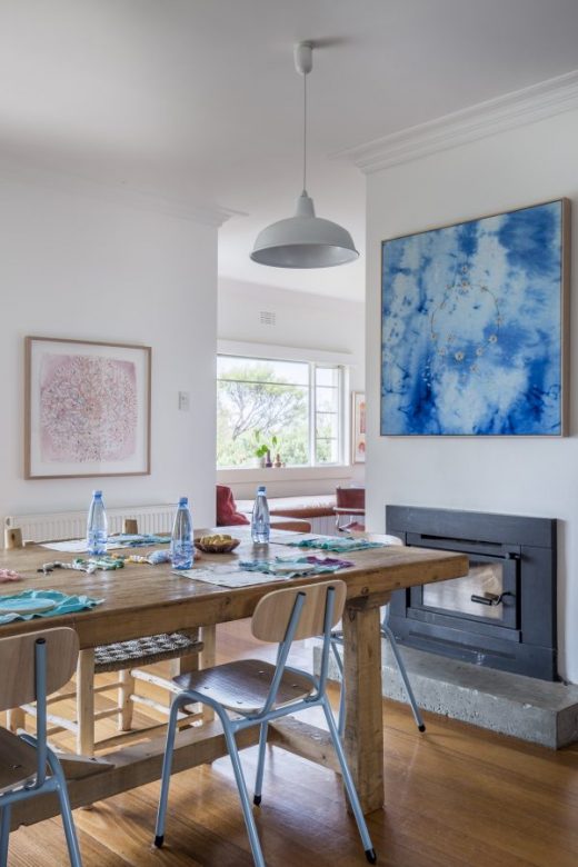 Yes, a really eclectic mix of prints, originals, photography and objects. My grandmother’s cross stitch sits alongside framed paintings by the kids and contemporary illustrations and paintings. I love hanging objects on the walls; necklaces, ceramics, weavings, baskets and trays.