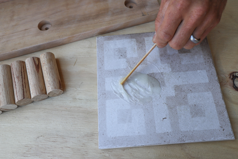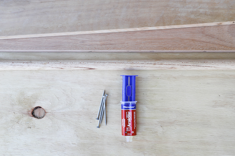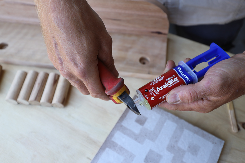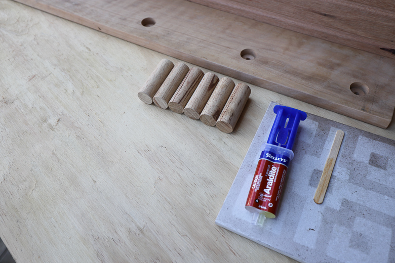 Use Selleys Araldite 5 Minute Epoxy Adhesive to fix the knobs into position. Apply glue to both surfaces – some on the end of the timber knob and some inside the hole. Insert the timber knob so it’s a nice firm fit. The initial bond of the glue will take in just 5 minutes, but we’re going to leave it for a full 16 hours to achieve maximum strength.