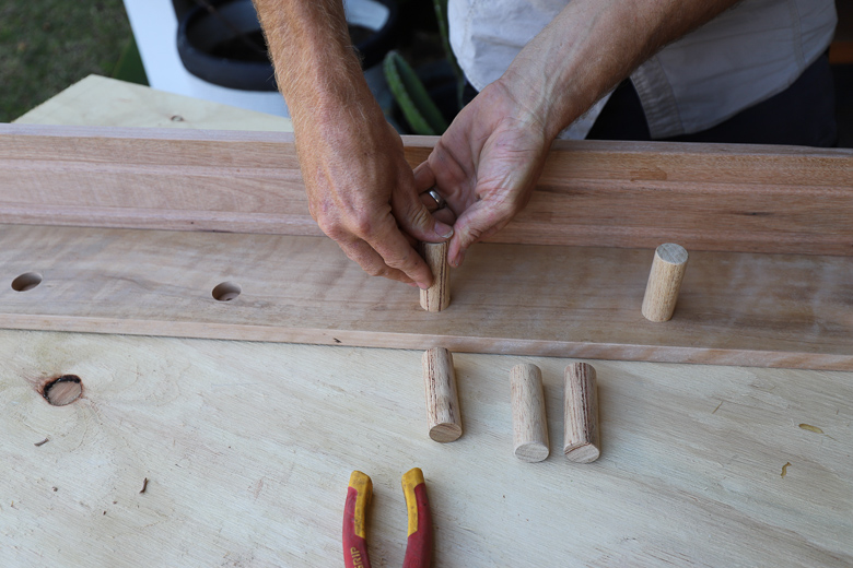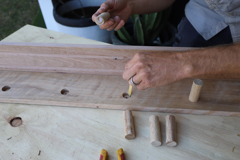Drill out the position of the timber dowel knobs using a 25mm spade bit – the same size as the timber dowel.