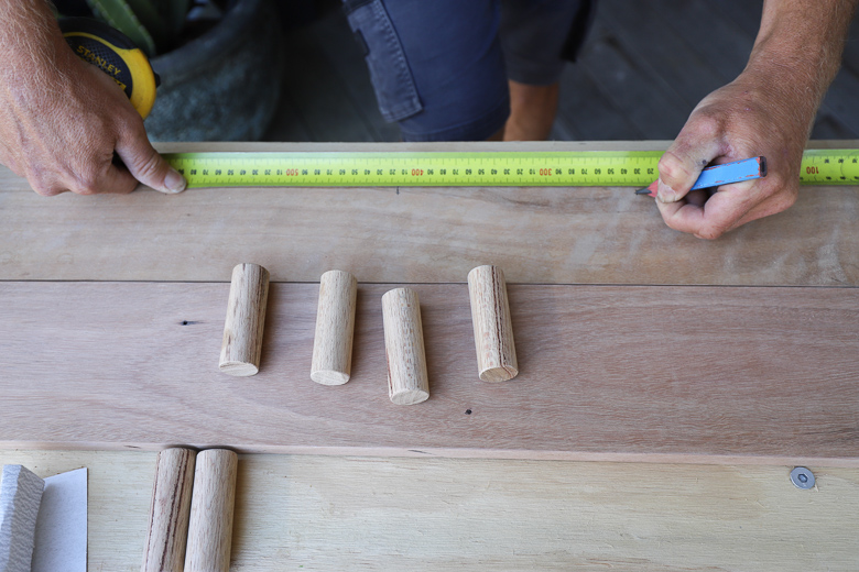 Once marked, cut the timbers for the shelf and mounting rail to length. Cut the dowel into short lengths for the hanging knobs. Mark and measure out the position of the dowel knobs along the mounting rail.