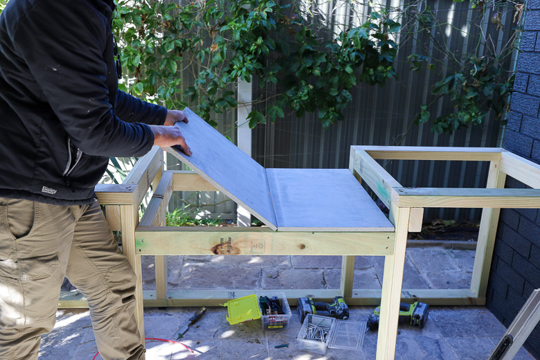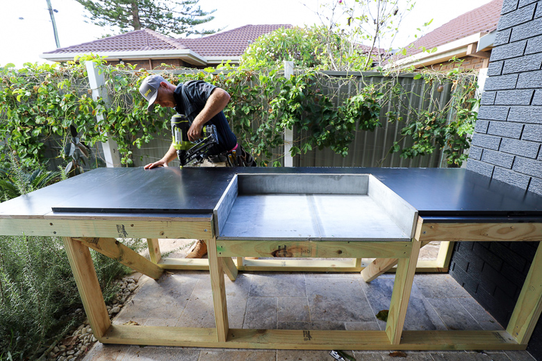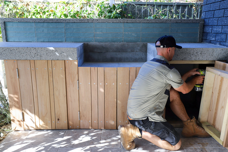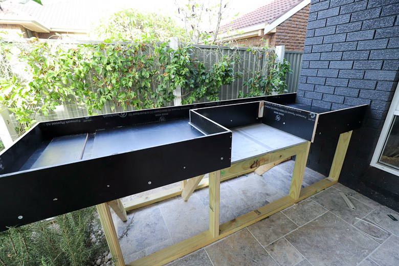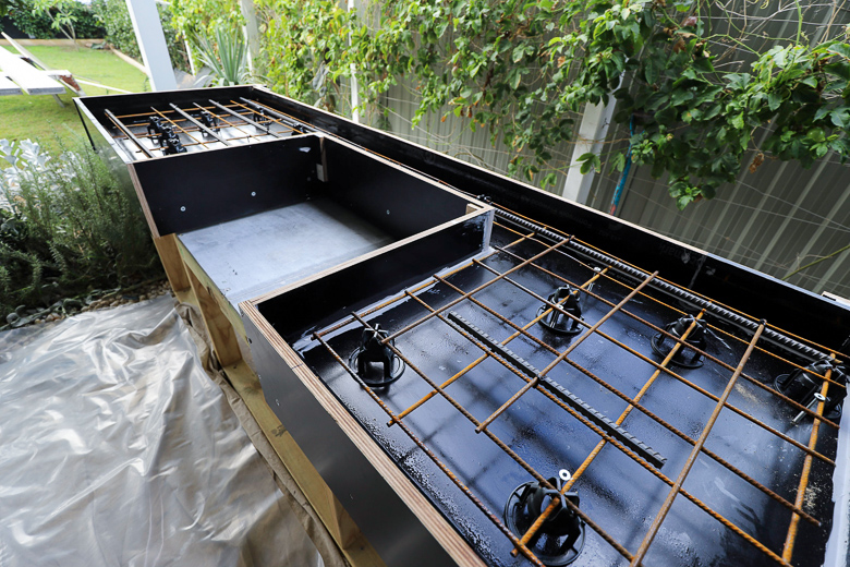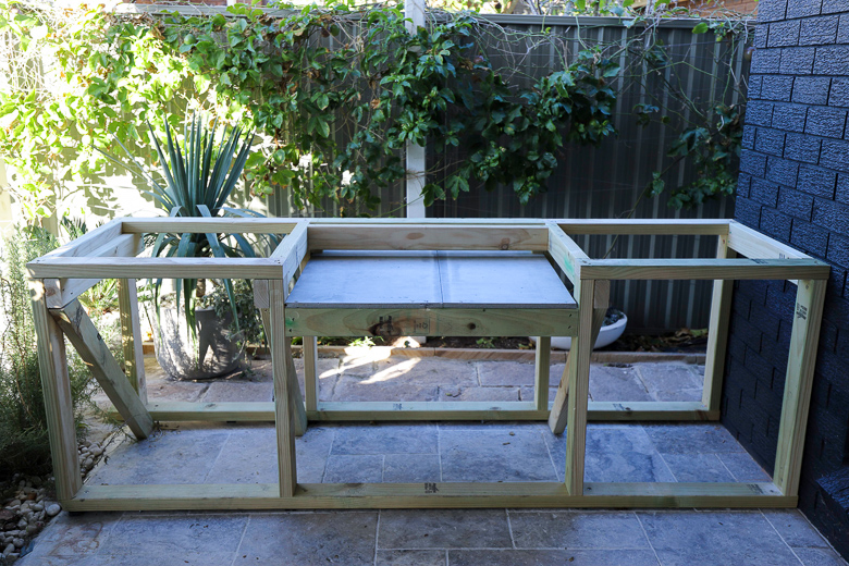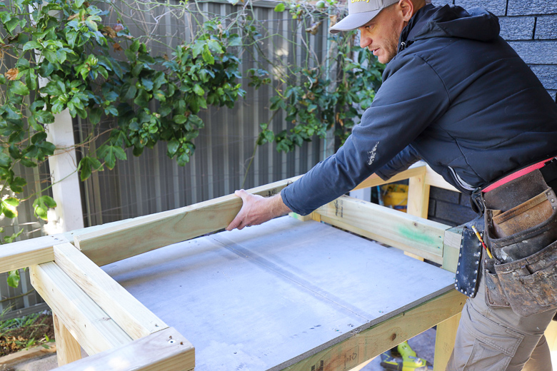 Creating a splashback is optional. I’ve built mine using a timber frame, cladded with villaboard and surrounded by a concrete border. I made separate moulds and cast these at the same time as my bench top. You can then tile the villaboard with your choice of tiles.