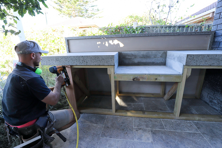 Insert the fibre cement sheets into the recess you’ve created for the BBQ and secure with nails or screws. Frame in the rear of the recess, remembering to keep adequate distance for ventilation. The fibre cement surrounds of the recess are important as they form non-combustible protection to the timber framing.