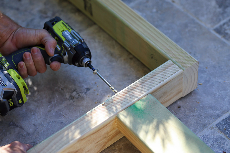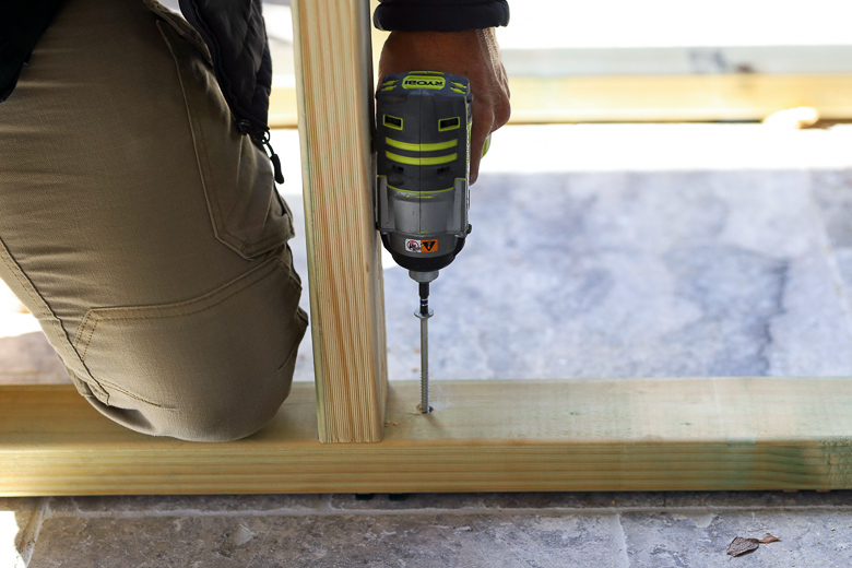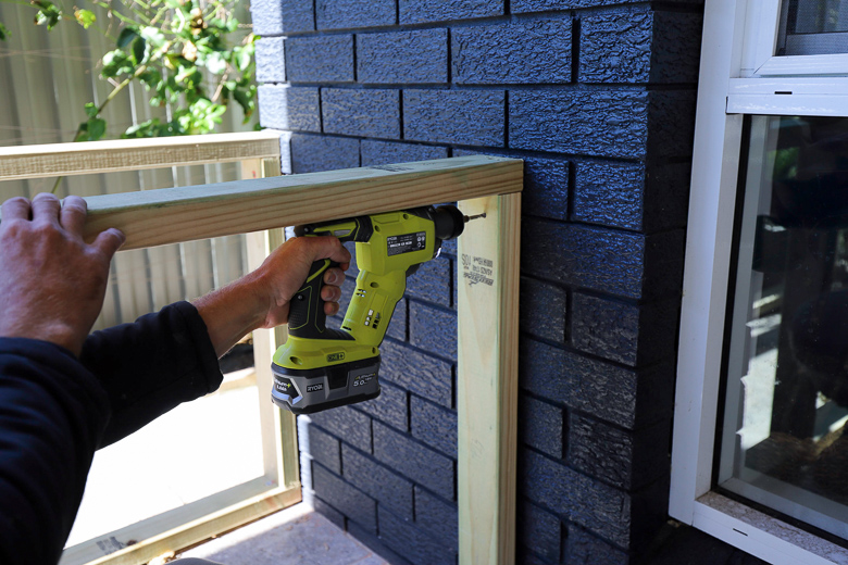 I’m screwing down my frames into position against the exterior wall of our home and down to the floor. At this point, make sure your frames are level. Next, connect the two frames with more timber to make one solid and complete unit.