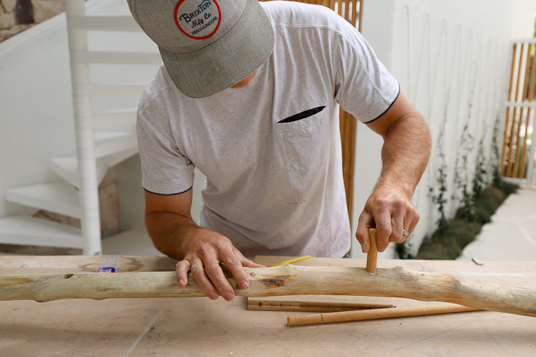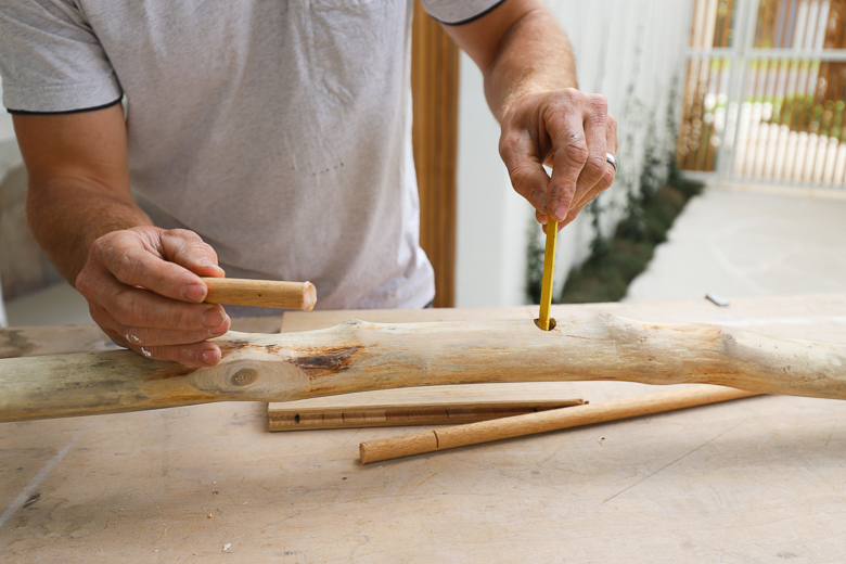 We’re attaching our driftwood with two pieces of timber dowel, so we need to mark out where that dowel is going to sit. Make marks on the driftwood towards the top and bottom of the driftwood and that will indicate where we’re going to drill holes for the dowel.