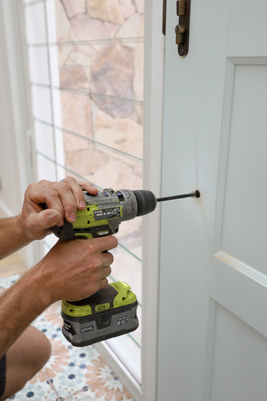 Use the spade-bit again to drill holes into your door – about 20-25mm deep. Dry fit the driftwood handle before applying any glue to ensure correct positioning.
