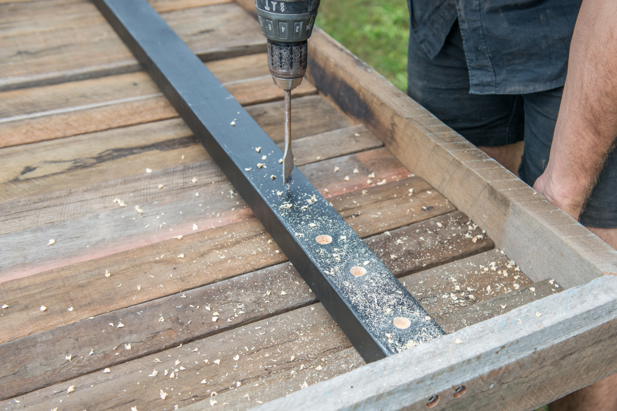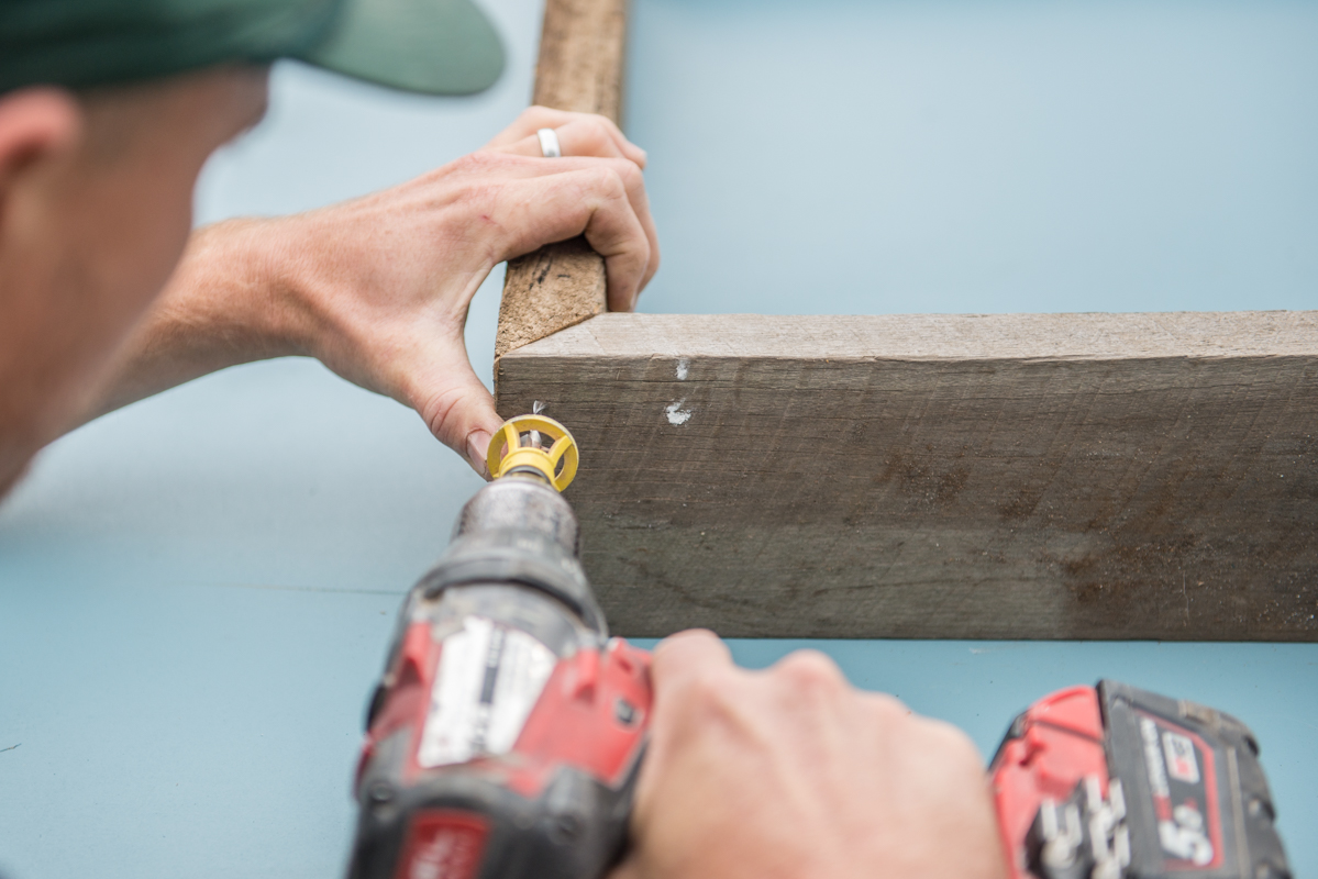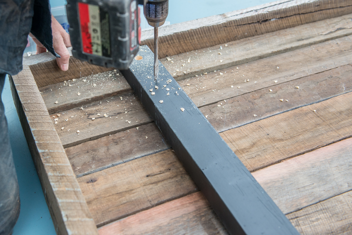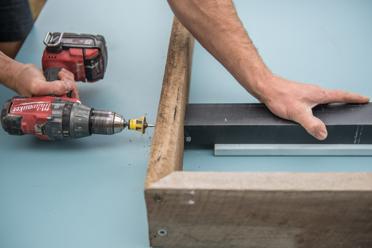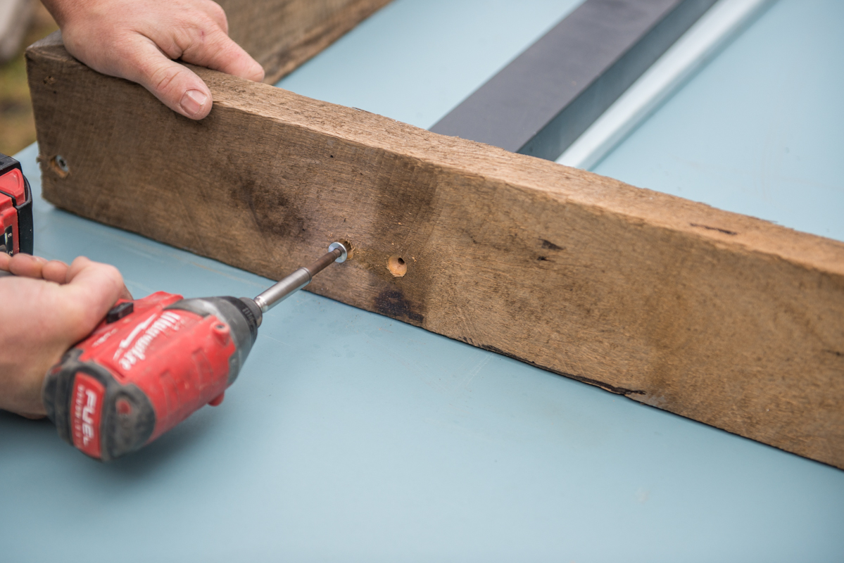 Have your drill and screws ready to go. With someone at the front of the bedhead holding each timber in place, screw through the back of your rail into the feature timber. We’ve countersunk our screws into the rail. Be careful that your screws don’t protrude through the face of your feature timber.