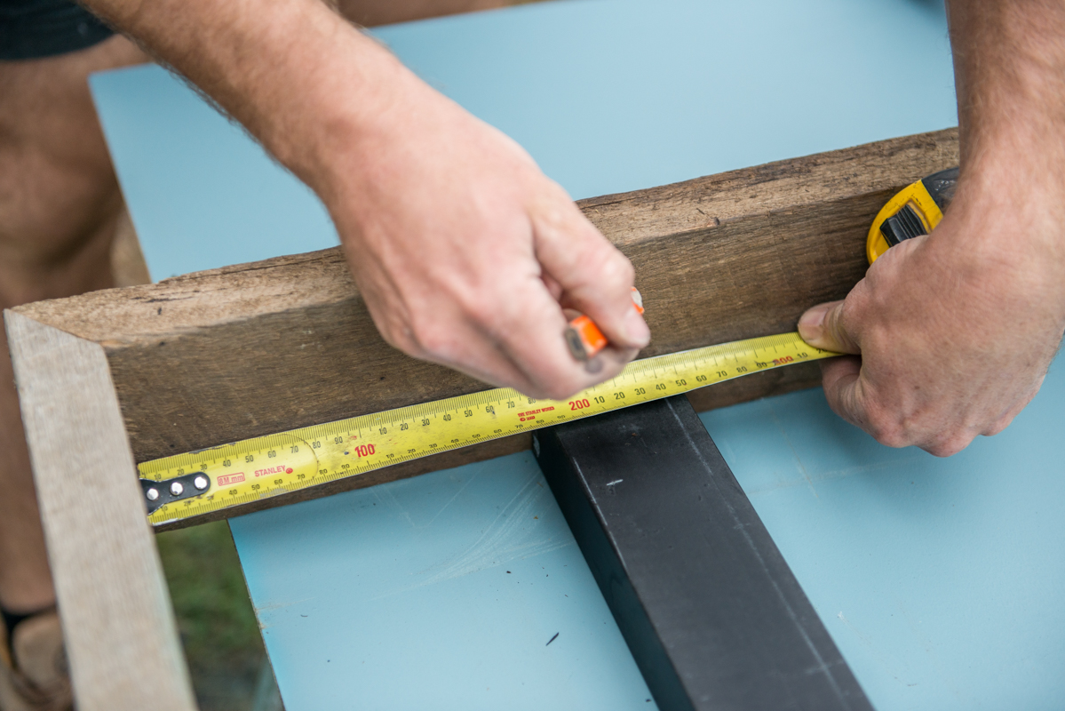 Stand your frame upright. Insert all your feature timber pieces. We’ve varying lengths and thicknesses to create a rustic, staggered look.