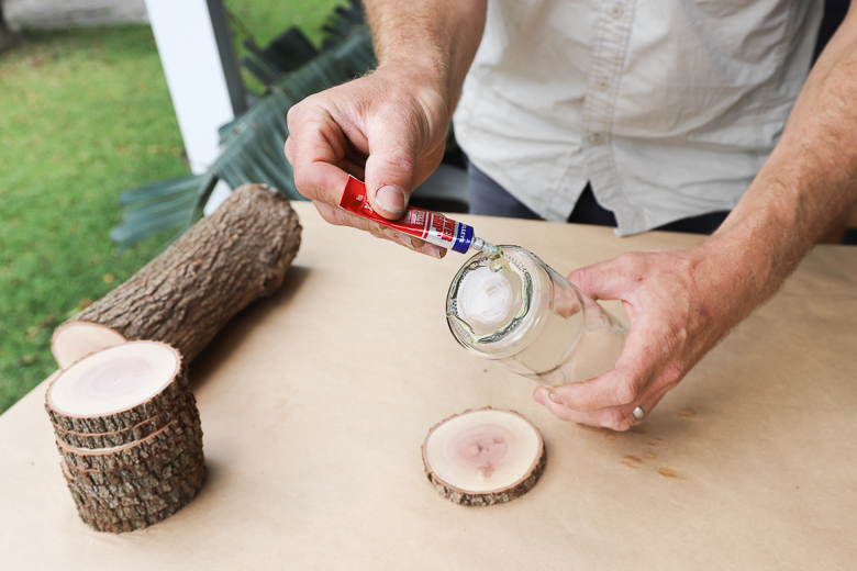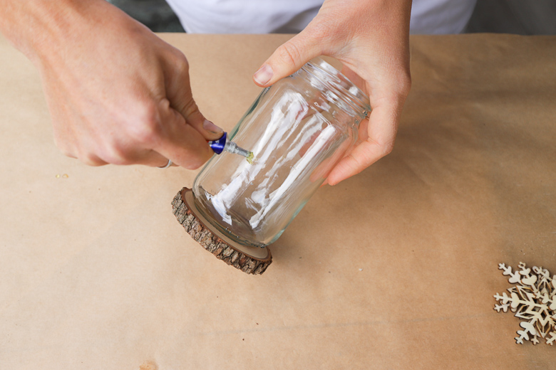 We’re using Selleys Power Grip to stick the glass and timber together. It’s an awesome all-purpose glue that sticks and withstand almost anything! Make sure the glass and timber are free of dust. Remove the cap from the glue and apply to the dry surface. Place the glass on top of the timber, ensuring the jar is nice and centred. Apply some pressure for about 60 seconds to allow for good initial contact.