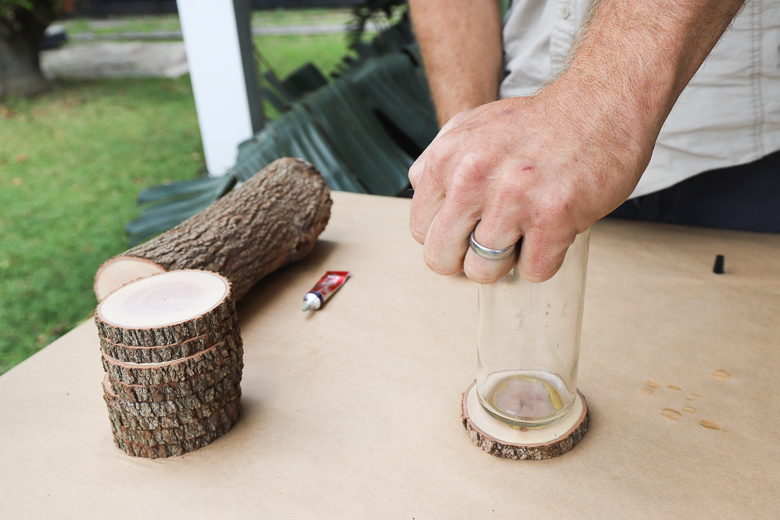 Set yourself up on a nice level bench to work on. Overhang your branch off the end of the table and make a series of cuts around 15mm. It’s up to you how thick or thin you make your cuts, but make sure it’s nice and level for the glass jar to sit on.