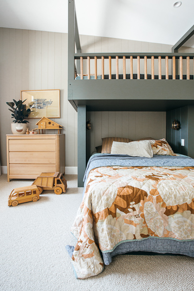 As a kids we’d dream of nautical-inspired bedrooms, and now was our chance to recreate those visions – whether our kids wanted this or not! 😉 We’ve created a versatile bedroom that we envision will change in configuration over time. The wall colour, Taubmans Endure ‘Weathered Stone’, has created a beautiful warm base to layer blues, oak and mustard and the nautical bed lights are a hit with the kids.