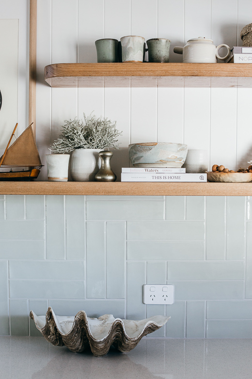For the splash back, we’ve decided to compliment the door fronts by tiling with Florencia Sea Foam Gloss Subway Tiles from Beaumont Tiles. Where the original cabinetry for the oven was positioned, we’ve installed two custom Blackbutt timber shelves. This has given more bench space but also makes the kitchen feel a lot more spacious.