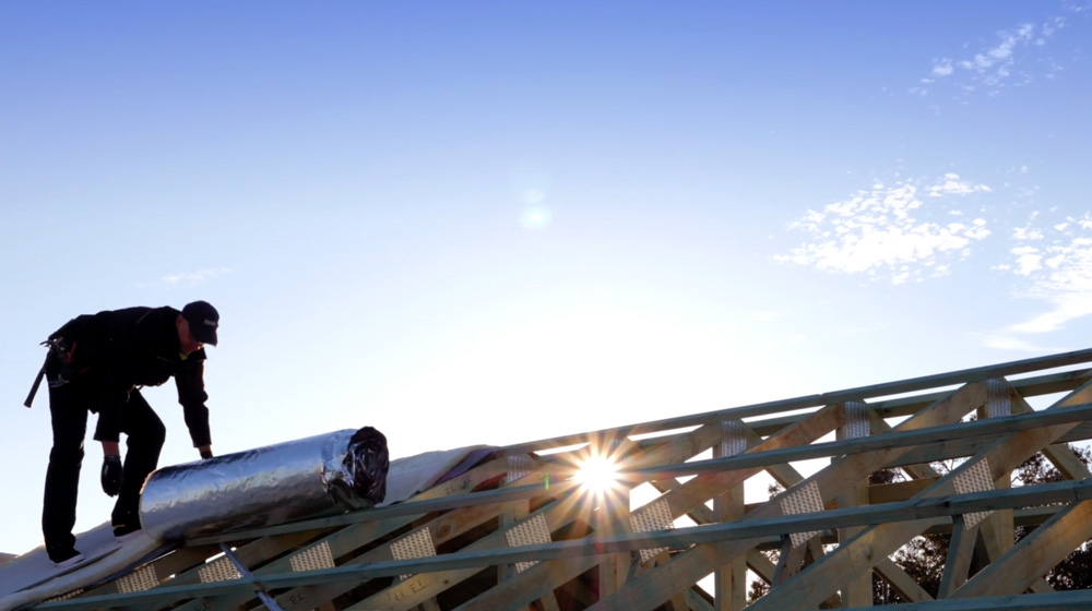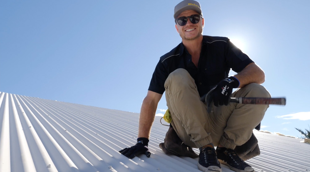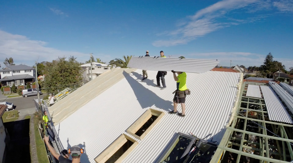 The day the roof was installed, the site was buzzing. Literally weeks and weeks of preparation has lead to this point – the renovation begins to resemble a home. We even had the COLORBOND® discovery van on site. It was all hands on deck with the team from ARC on site to lay and install the sheets. First things first, the boys lay the insulation: we’ve used Bradford’s Anticon, specifically designed for temperature and noise control in homes with a metal roof.