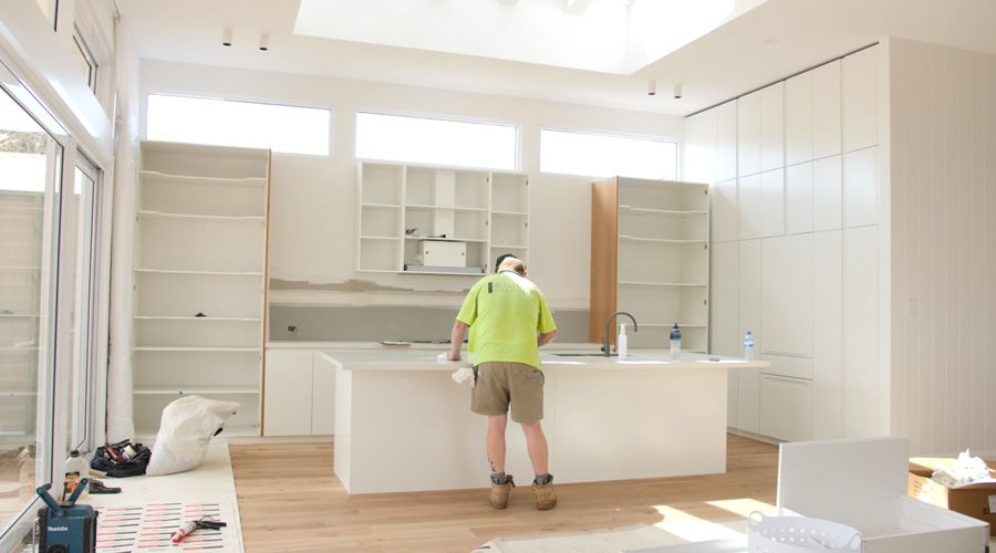 Next up is kitchen installation! We’ve had Beachside Kitchens complete the polyurethane cabinetry in Taubmans ‘Cotton Sheets’ in a matt finish. Loughlin Furniture have completed the timber detailing, and Edstein Creative Stone have installed the benchtops. Similar to our master bathroom, we’ve used Cosentino by Silestone ‘Yukon’ in suede. This finish is a favourite of ours as it’s not your typical ‘shiny’ benchtop.