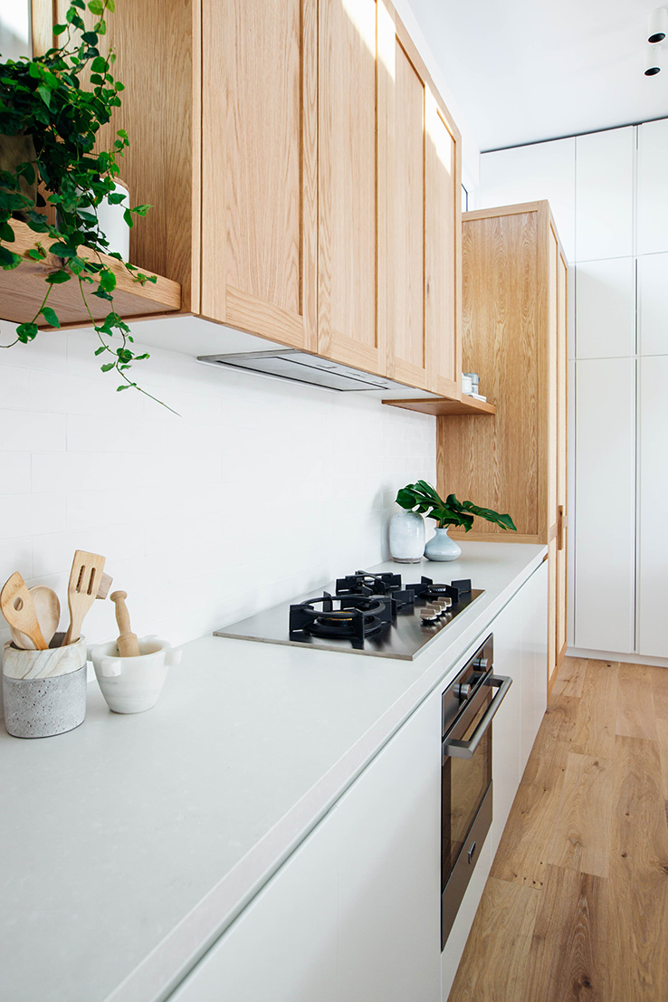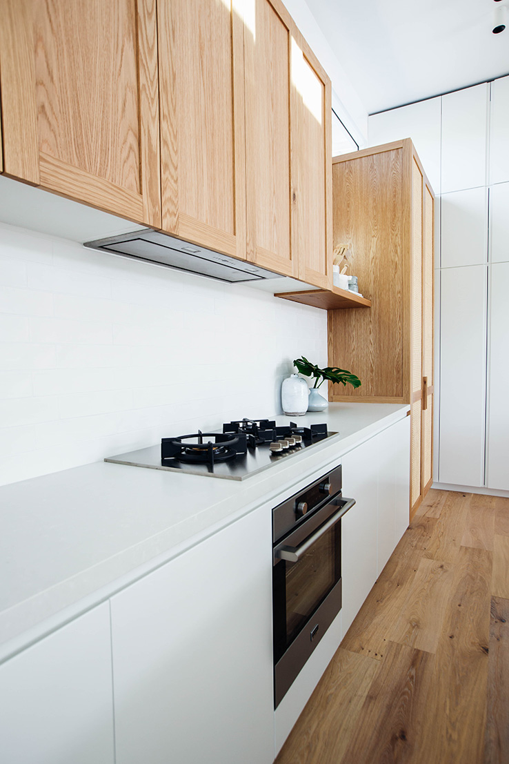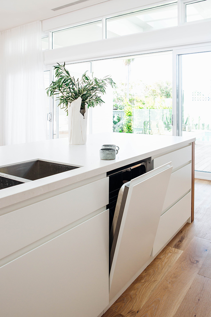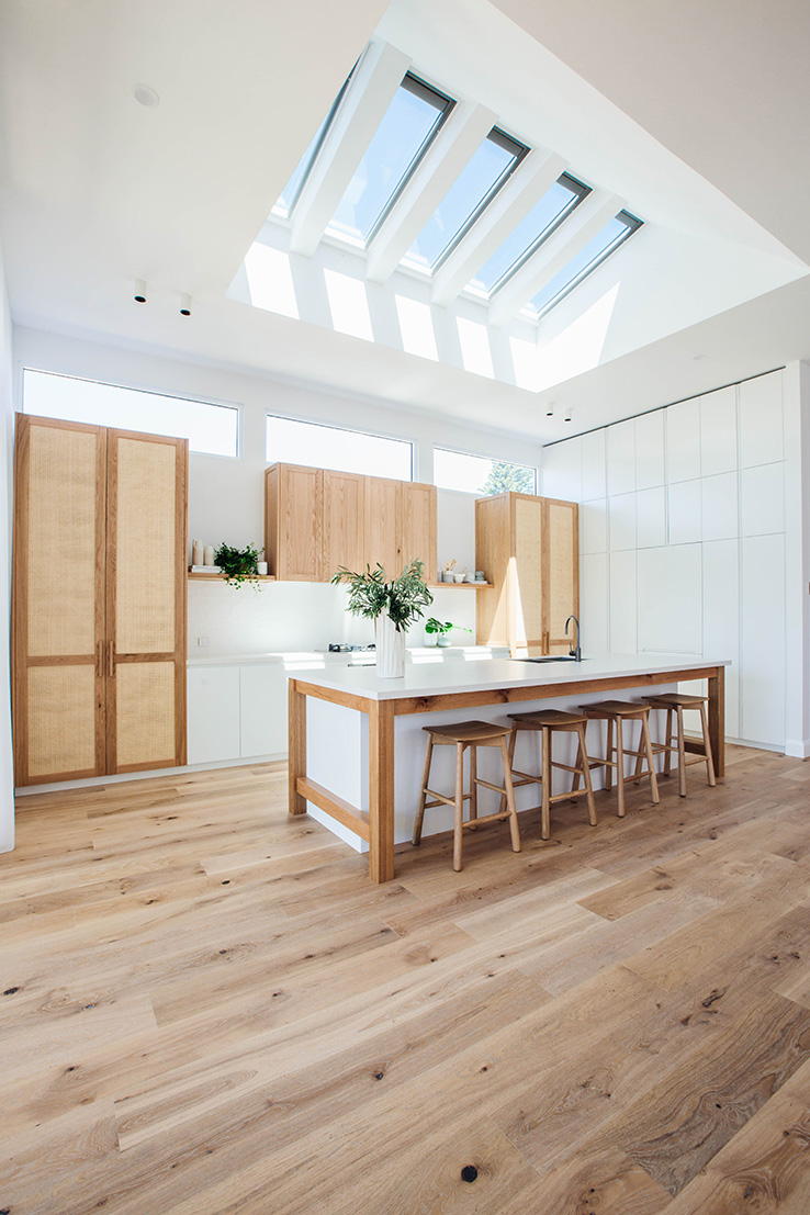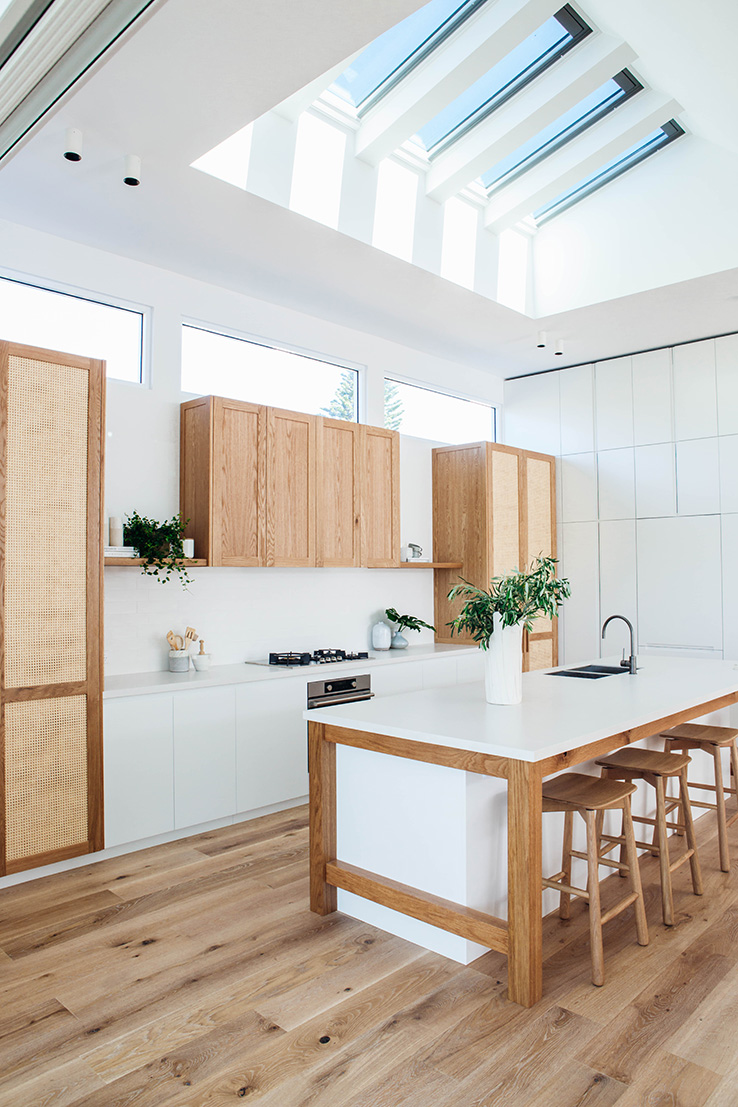 In any house we’ve lived in, the kitchen has been the heart of the home. For us, we love nothing more than enjoying the company of friends and family over a good meal. We’re relaxed entertainers so preparing food together is always time well spent. Island benches are so great for this. The vault of Velux skylights above this island bench is such an architectural statement and the timber detailing around the bench adds another level of character. We’re big fans of integrated appliances for a streamlined look.