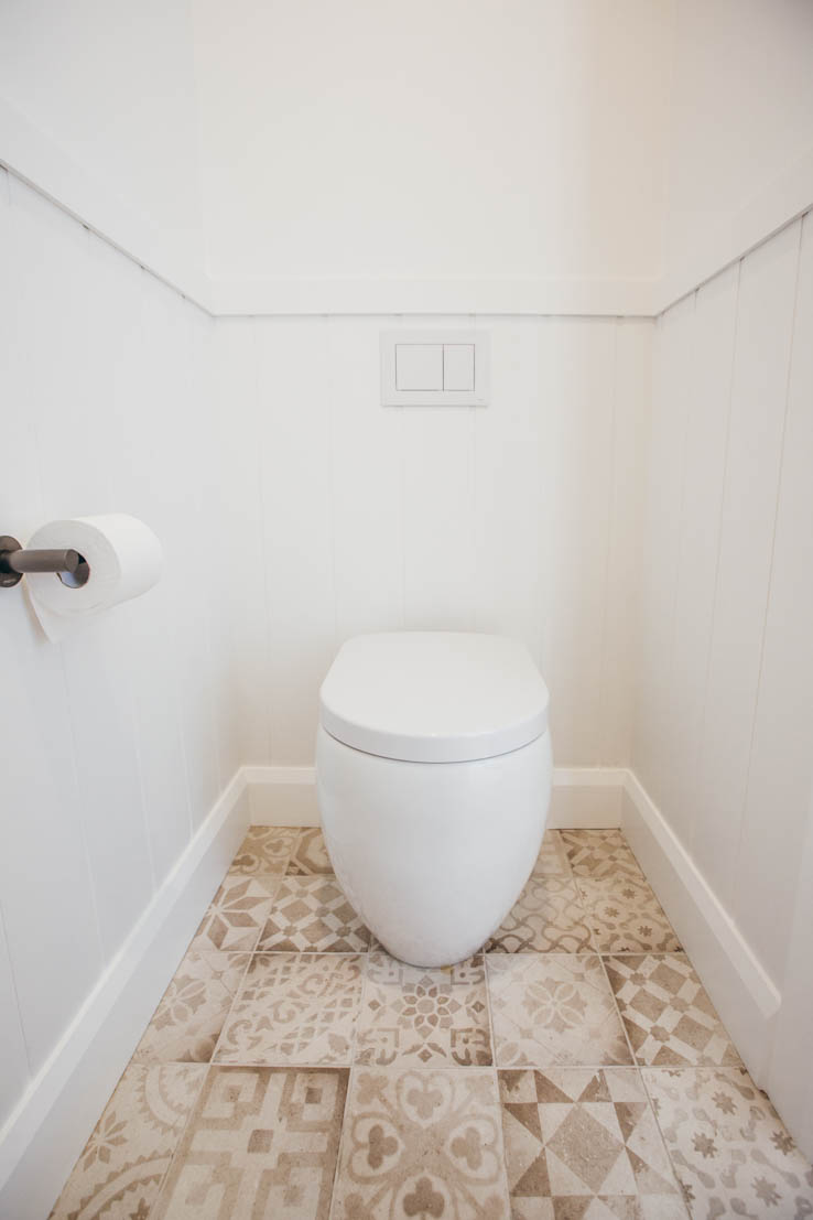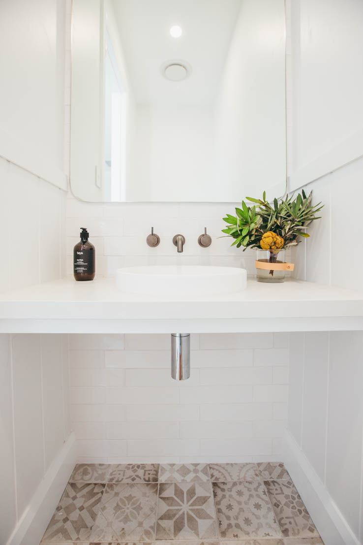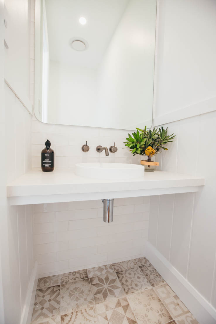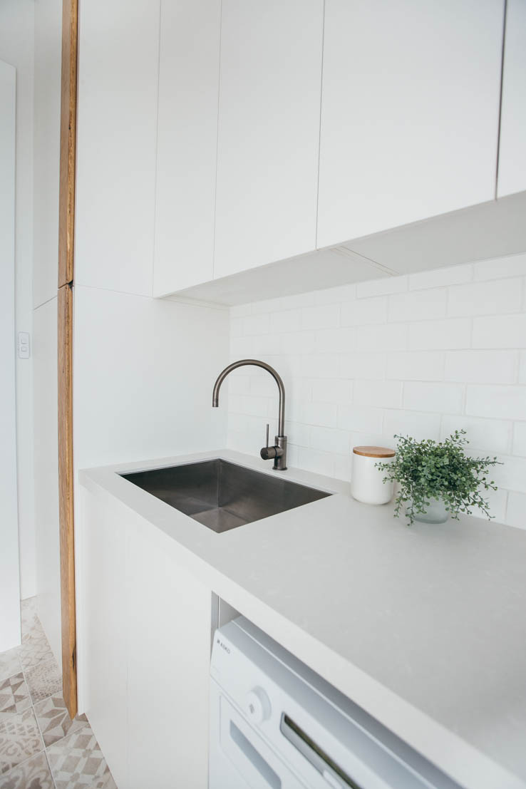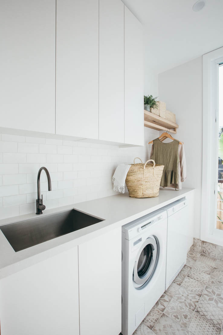 When designing this space, we wanted to capitalise on the beautiful easterly morning light, and a Wideline louvre window was the perfect choice. The patterned floor tiles have long been a favourite of mine, and work well with the simple white cabinetry and timber details. I love the timber hanging rail and will no doubt be incorporating this into our next laundry design.