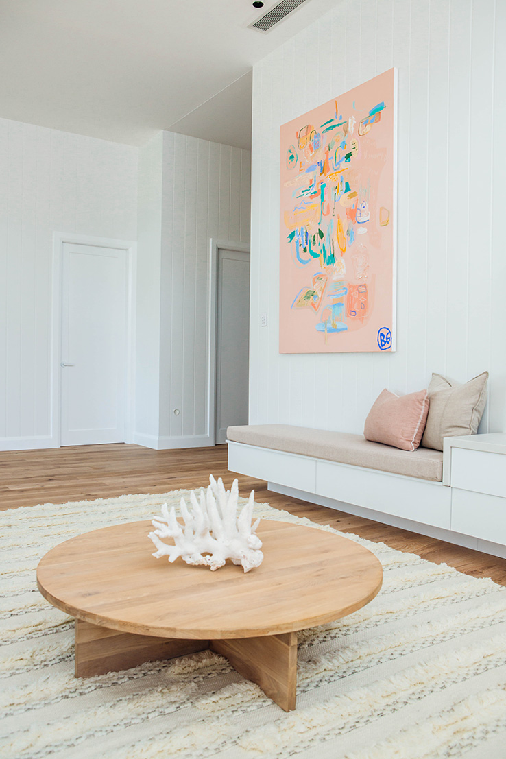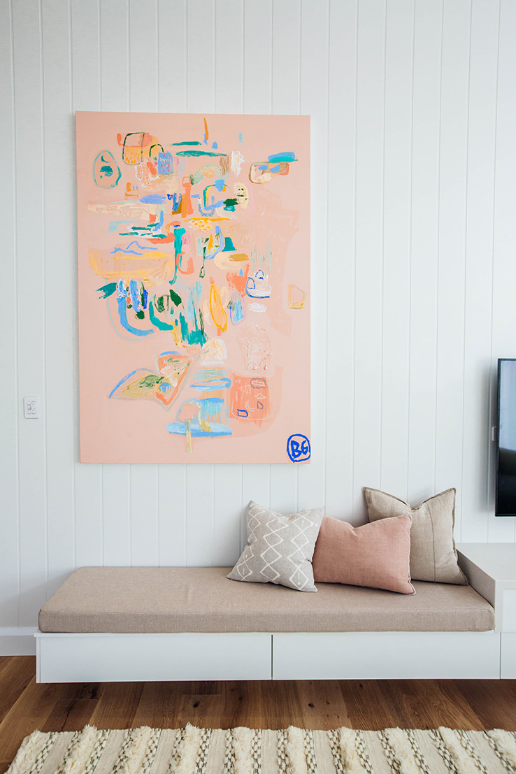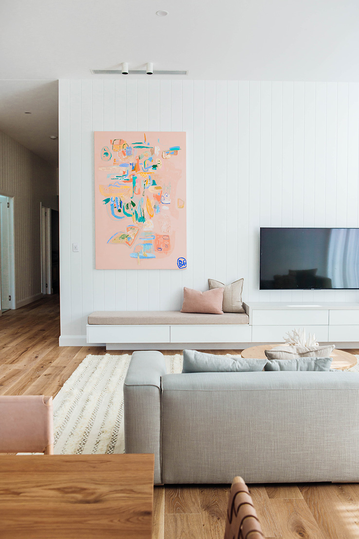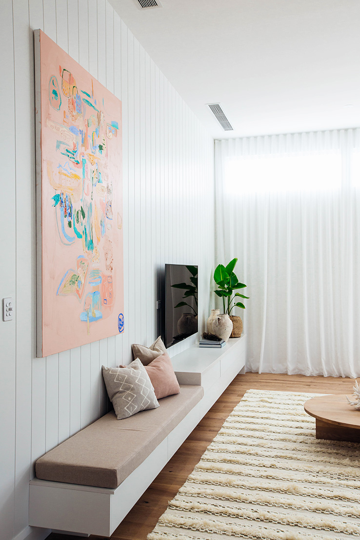 Our goal was to create a light-filled sanctuary that felt comfortable and inviting. The key features of this space are hands down the soaring 3.6m ceilings, Easycraft ship-lap paneling and Wideline highlight windows. Add to this the floor to ceiling sheer curtains, which help to soften the space and create a relaxed vibe. We wanted the entertainment unit to run the full length of the wall, yet not feel too obtrusive, so to step down into a bench seat was a great option. The whole space is lifted with the amazing custom artwork by the talented Bonnie Gray. It’s a real sanctuary but with plenty of space for entertaining!