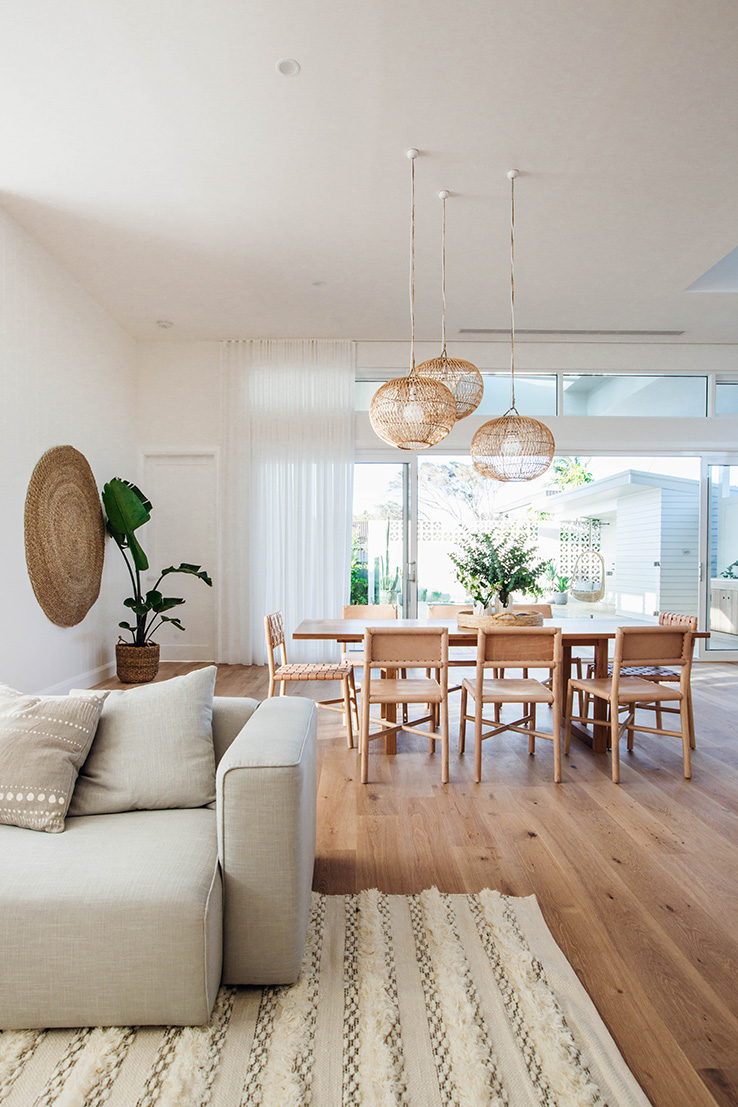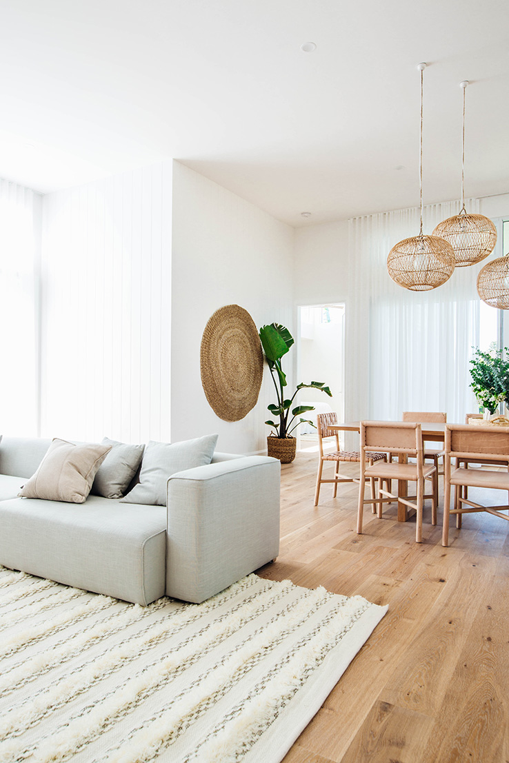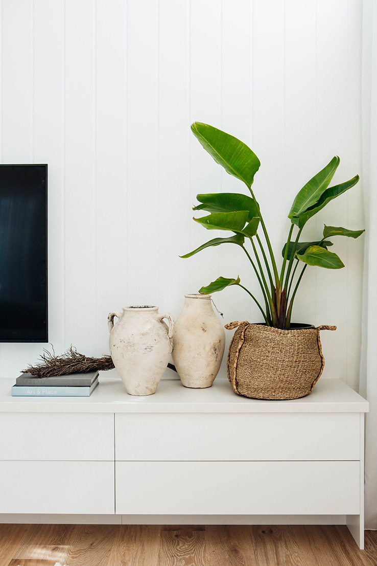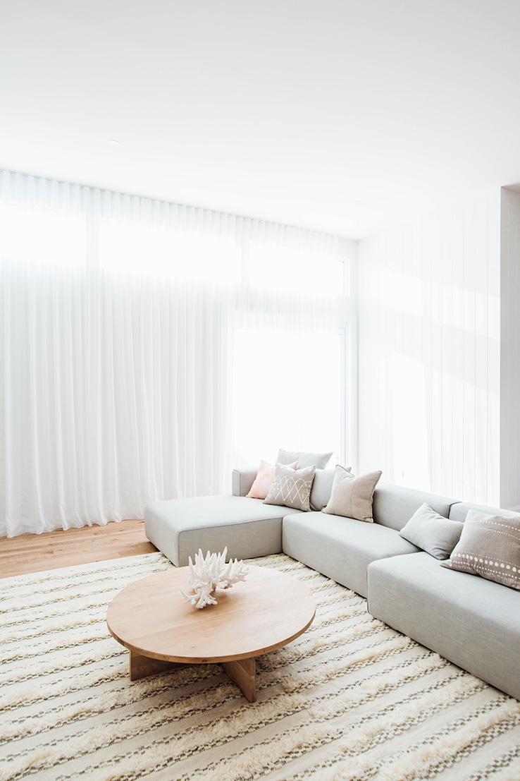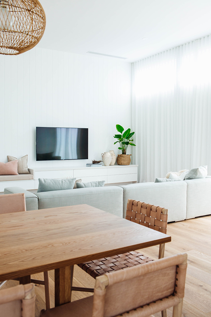Our goal was to create a light-filled sanctuary that felt comfortable and inviting. The key features of this space are hands down the soaring 3.6m ceilings, Easycraft ship-lap paneling and Wideline highlight windows. Add to this the floor to ceiling sheer curtains, which help to soften the space and create a relaxed vibe. We wanted the entertainment unit to run the full length of the wall, yet not feel too obtrusive, so to step down into a bench seat was a great option. The whole space is lifted with the amazing custom artwork by the talented Bonnie Gray. It’s a real sanctuary but with plenty of space for entertaining!