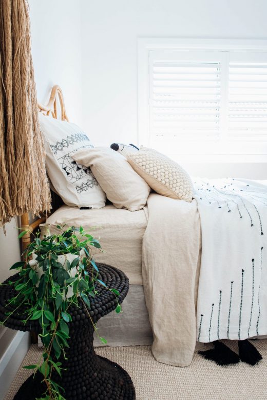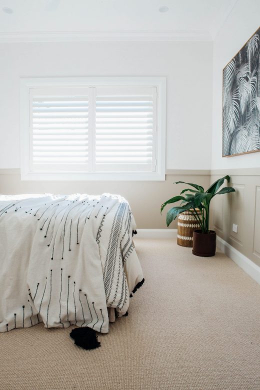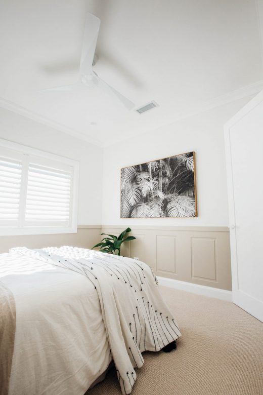 This room is essentially the second guest bedroom. It was important for us to keep the space flexible for a buyer to use as they require – whether that be a kid’s bedroom, a home office or a guest bedroom. The wall panelling and plantation shutters are a great investment in this space, as they add a quality look and feel. The addition of art and a bed with gorgeous linen gives this room just the right amount of personality.