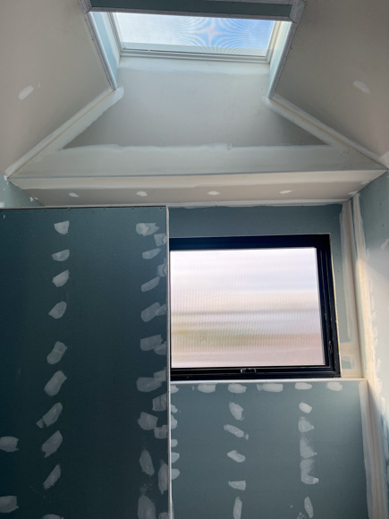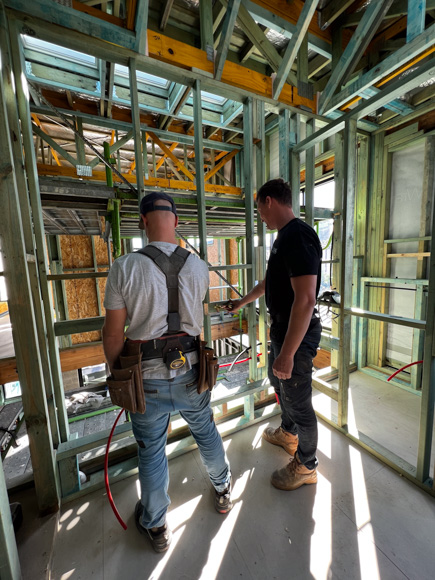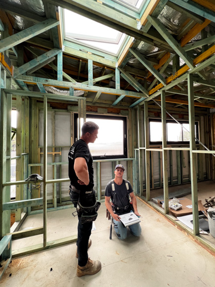 Time to turn our attention to the main bathrooms of each home and I’ve got to say, bathrooms would have to be one of our favourite rooms to design. With the layout of these rooms squared away back at the planning stage, it’s time to create two different takes on the one design. Natural light and ventilation is always at the forefront of our minds in a bathroom – and the addition of the opening Velux skylights and the Wideline Paragon window frame (with fluted glass) are the first to be installed. We’ve framed the skylights to create a light void and it’s going to create a sense of grandeur when you walk in – even at framing stage it looks good!