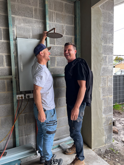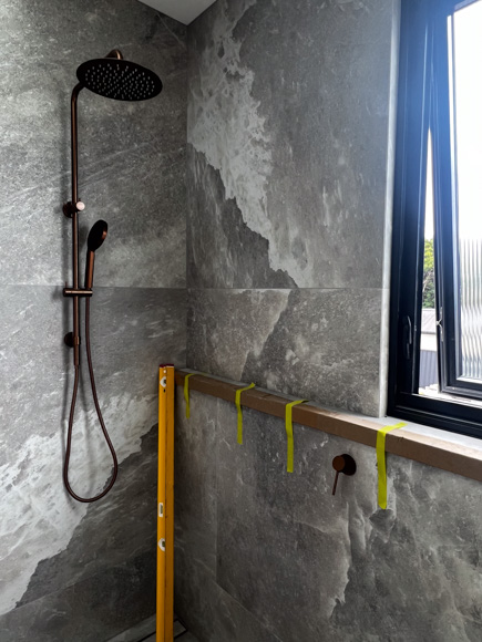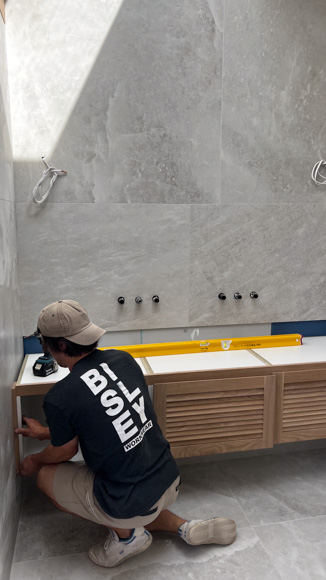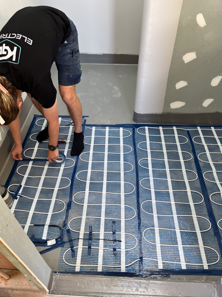 Next up, it’s Gyprock time and in the wet areas we’ve used AquaChek™ 10mm plasterboard, which is the perfect lining for residential wet area application. One thing we aim to include in all our new bathrooms is Hotwire Underfloor Heating. We were first introduced to Hotwire 10 years ago during our time on The Block where we used Hotwire in our whole downstairs apartment and absolutely loved the level of comfort and warmth it provides. During winter, we have our bathroom floors at home on a timer and it’s often the only heating we have on. It’s more cost effective than you might expect, and for us it’s a must – especially in a bathroom of this calibre.