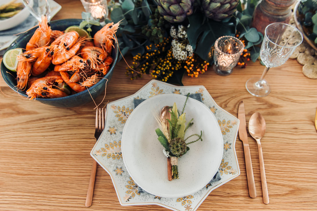 When entertaining for a group of people, it’s sometimes hard to ensure everything is matching. But don’t let this worry you, as it’s often the ‘mismatched’ feeling of a table that can add charm. Here we’ve used a mix of bronze cutlery from Maxwell & Williams with gold cutlery from Kmart. As a centrepiece we’ve used rustic timber candle holders with scattered vintage glass tealight candle holders. Again, we’ve used a mix of simple champagne flutes and more detailed vintage crystal glasses. Don’t be afraid to head to your local second hand store and look for mismatched glassware – the key is to find similarities, so that the table doesn’t start looking messy. For example, we’ve stuck to glassware for drinks.