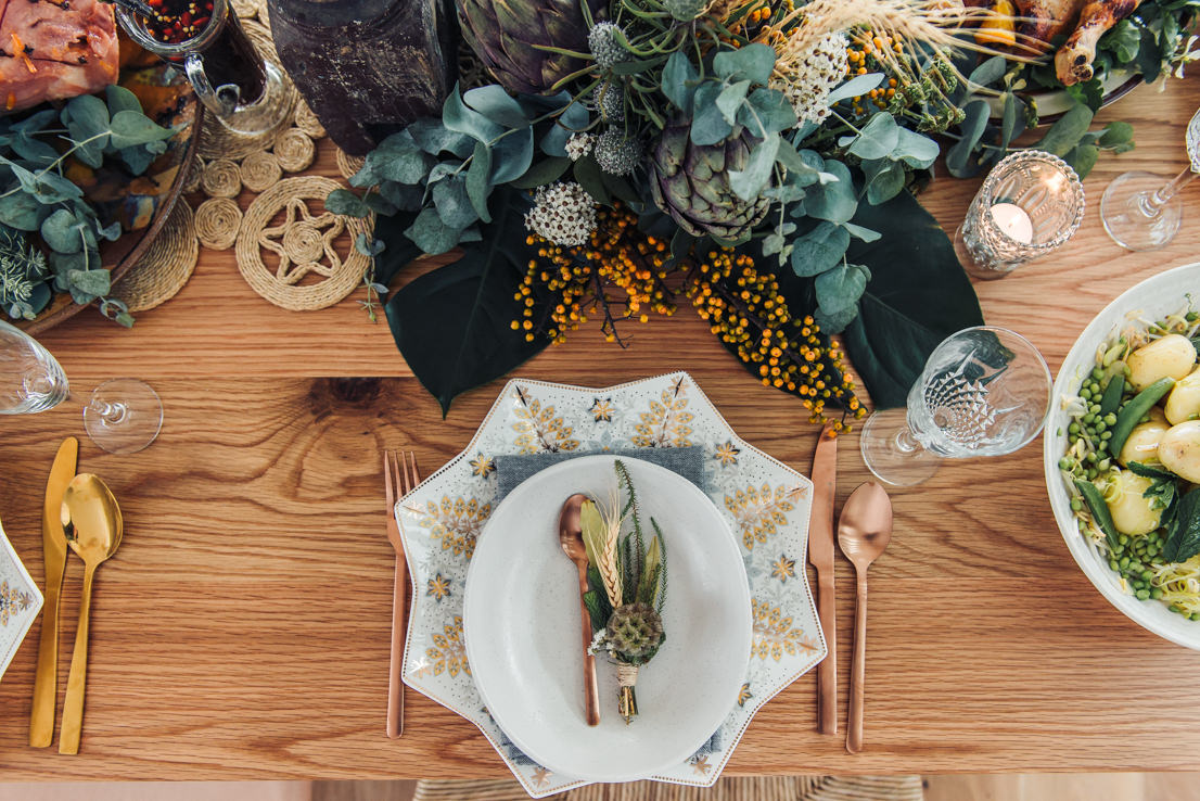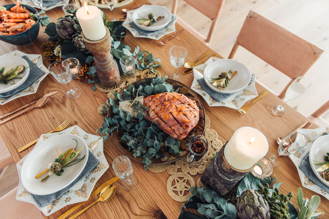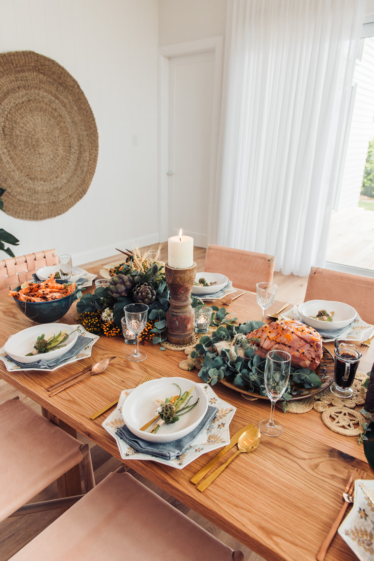 I admit that it helps when one of your besties is a florist – I’m not even biased when I say that Merrin from Merrin Grace Floral Design is one of the best! To create a centrepiece, Merrin has used a mix of artichokes, wheat, nutty leucs, South Australian daisy, blackberries, scabiosa pods, proteas, mini monster leaves and gum. We’ve also used the extra gum to decorate the Christmas ham. Choosing foliage that is seasonal will ensure your flowers last and will help to keep costs down. If using artichokes, be sure not to throw them out afterwards – they open up to become the most amazing bright purple flower!