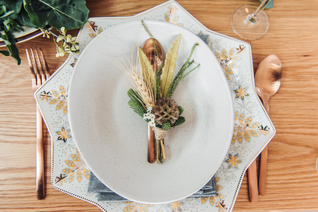 Native place settings with scabiosa pods, layered with Maxwell & Williams ‘Oh Christmas Tree’ plates