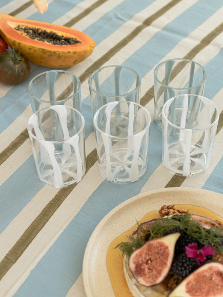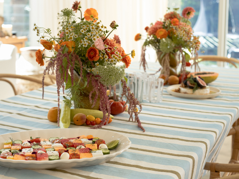 The table setting remains inspired by the soft painterly tones and natural textures of our Jardin tablecloths, placemats and napkins. For summer ease, we’re using our Acrylic Wine Glass and Tumbler range – the ideal solution to move easily between pool, beach, garden and table. We wouldn’t be without these!