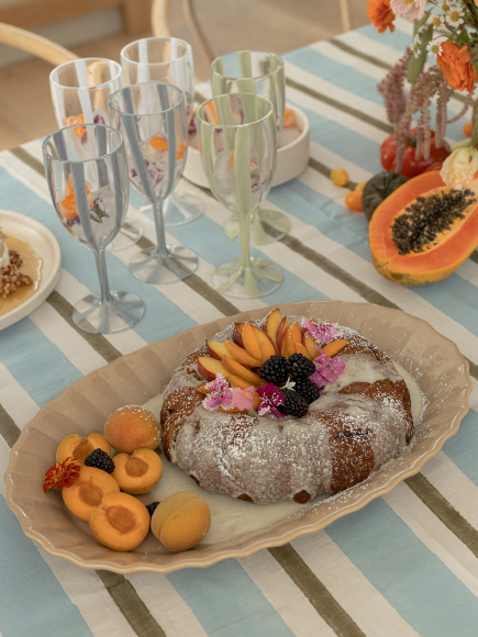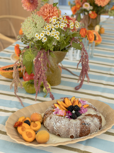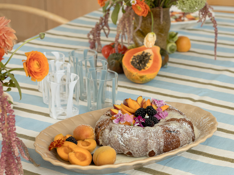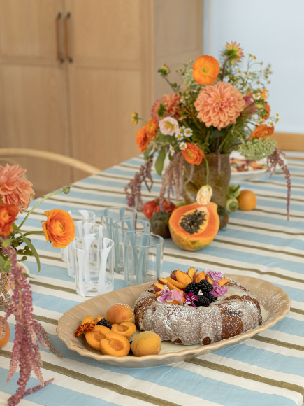 Following on from our recent summer table setting, we returned to the same softly layered tablescape to share a second recipe made for warm-weather hosting: a Brown Sugar Peach Cake with Lemon Glaze. If you missed the Smoked Salmon Platter recipe, check it out here.