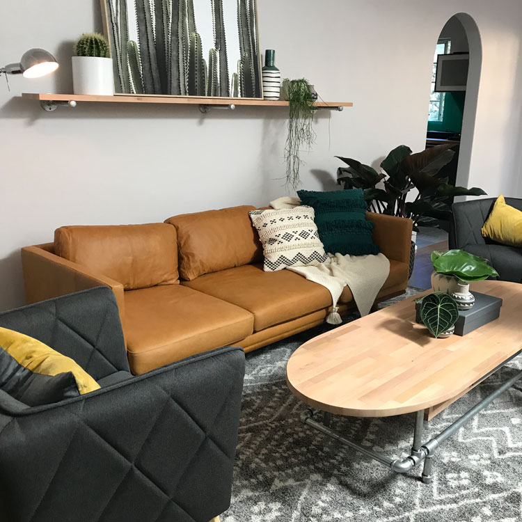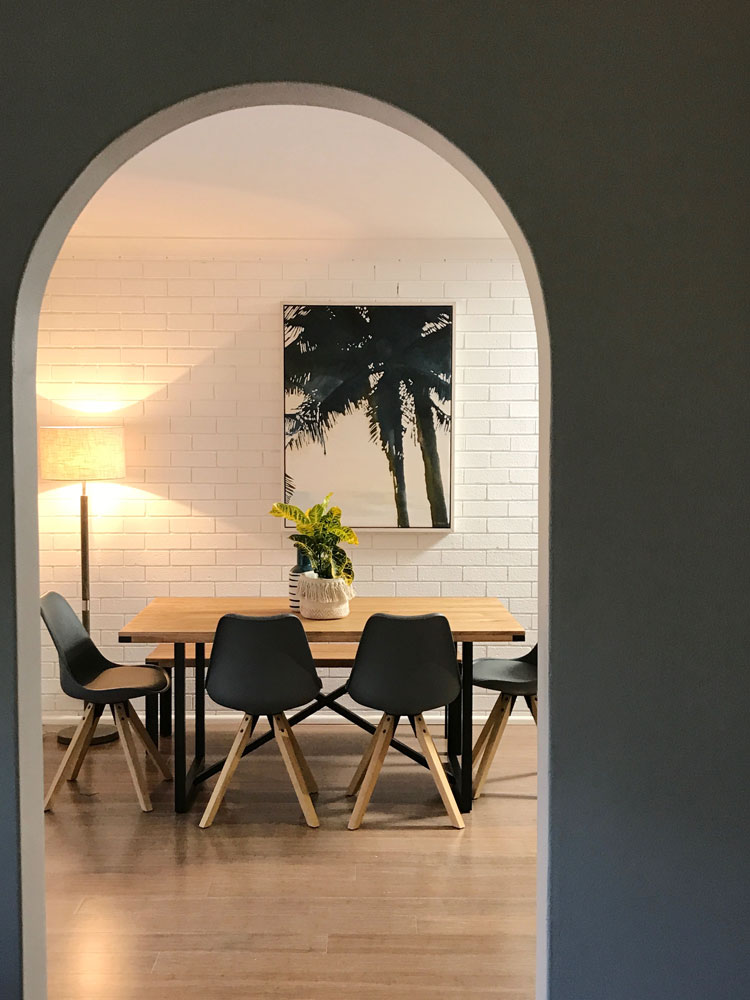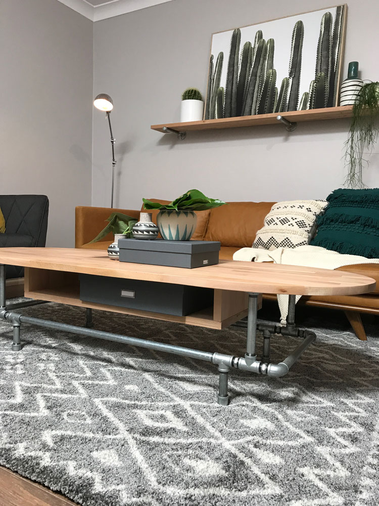 Our challenge set by Barry Du Bois was to make-over this room to give the brickwork a new lease on life, as well as create storage and display for their travel keepsakes and memorabilia. Given the room is long, narrow, and acts as a thoroughfare to the other areas of the home, we felt an oval-shaped coffee table (with storage, of course!) would be perfect. All materials are from Bunnings and it’s the perfect weekend DIY project! We’re really happy with the end result and most importantly, Steve and Mel loved it too!
