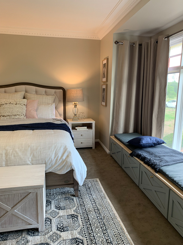 Our second port of call was the bay window, and how we could best utilise this space to its full potential. We designed a custom window seat which ran almost the length of the window, leaving room for an armchair to tuck into one end of the bay area. Added storage was incorporated by including drawers along the entire length of the window seat, which we customised with decorative crosses to tie in with our ‘Ocean Grove’ blanket box. A feature rug from Bunnings and some re-styling of Karen and Adam’s existing accessories and photos added those extra touches of personality that the original room was lacking.