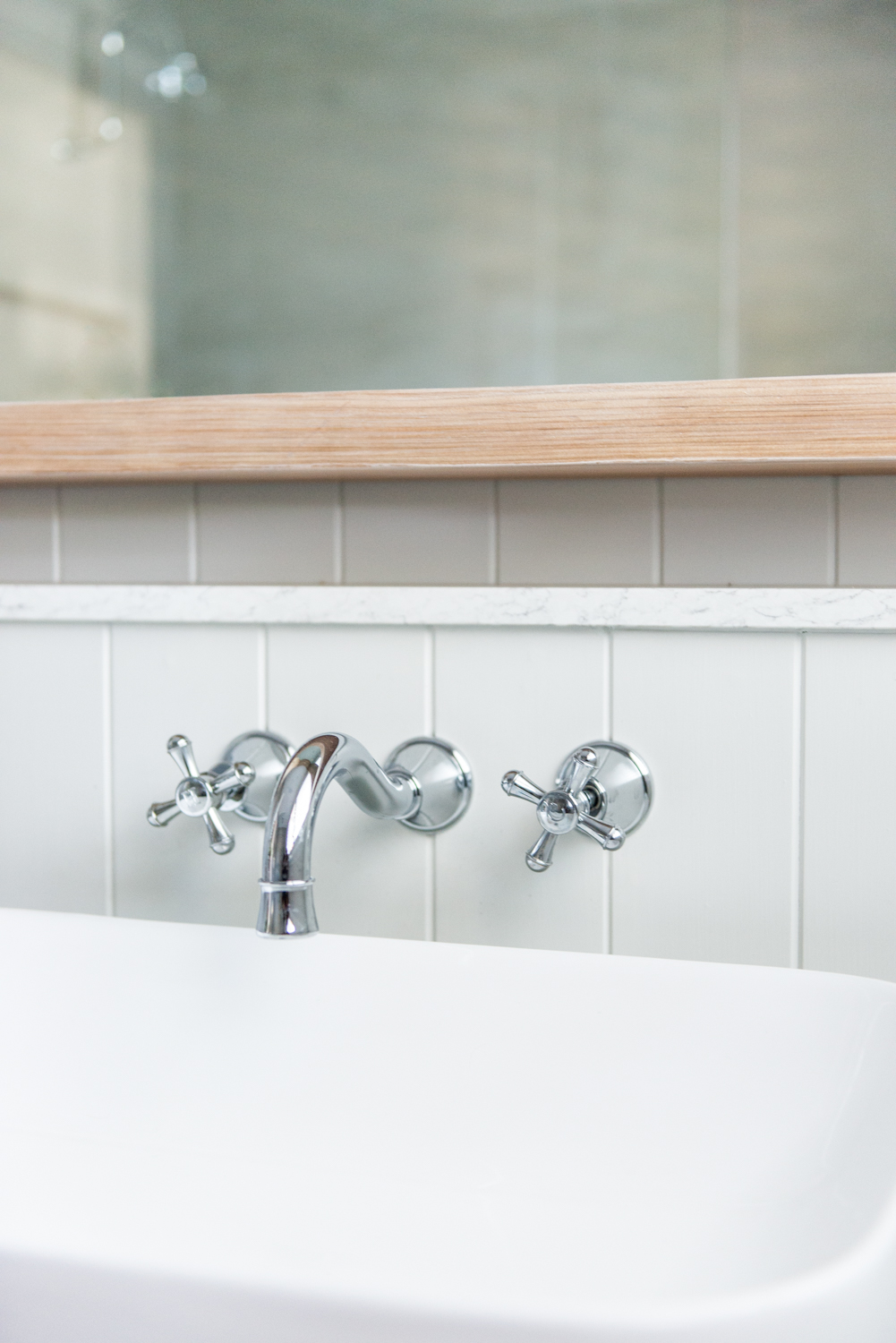 With this in mind, for Toowoon Bay Renovation we knew we were going to continue with Oak Cabinetry used in our upstairs bathroom (Check out all the details in ‘Upstairs Bathroom Reveal’) We designed this vanity and had it custom made at Loughlin Furniture. Leather handles from Made Measure We also loved the mix of Easycraft ‘EasyClad’ and ‘Devonshire 150x75mm Subway Tiles’ from Beaumont Tiles, so continued with this theme.