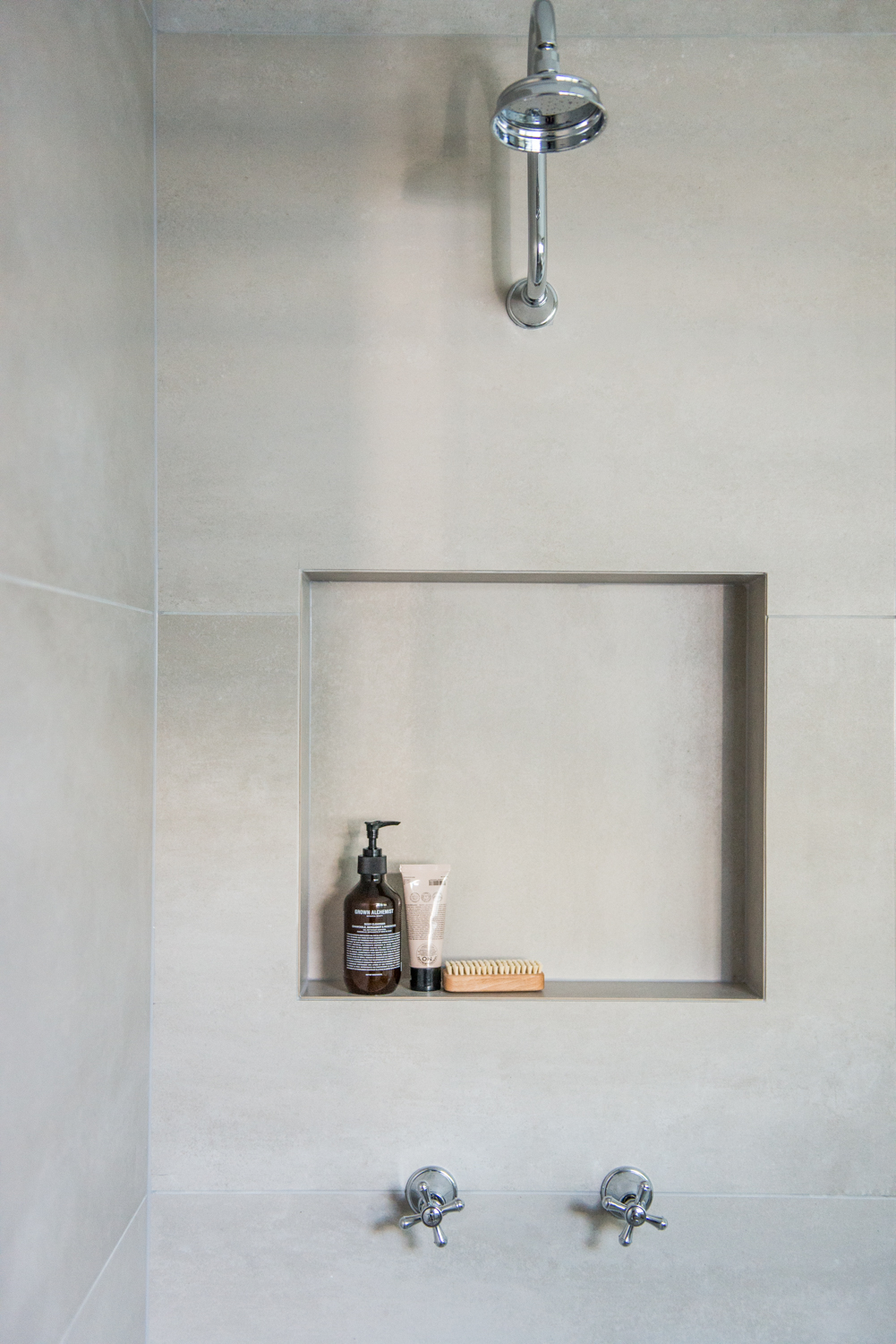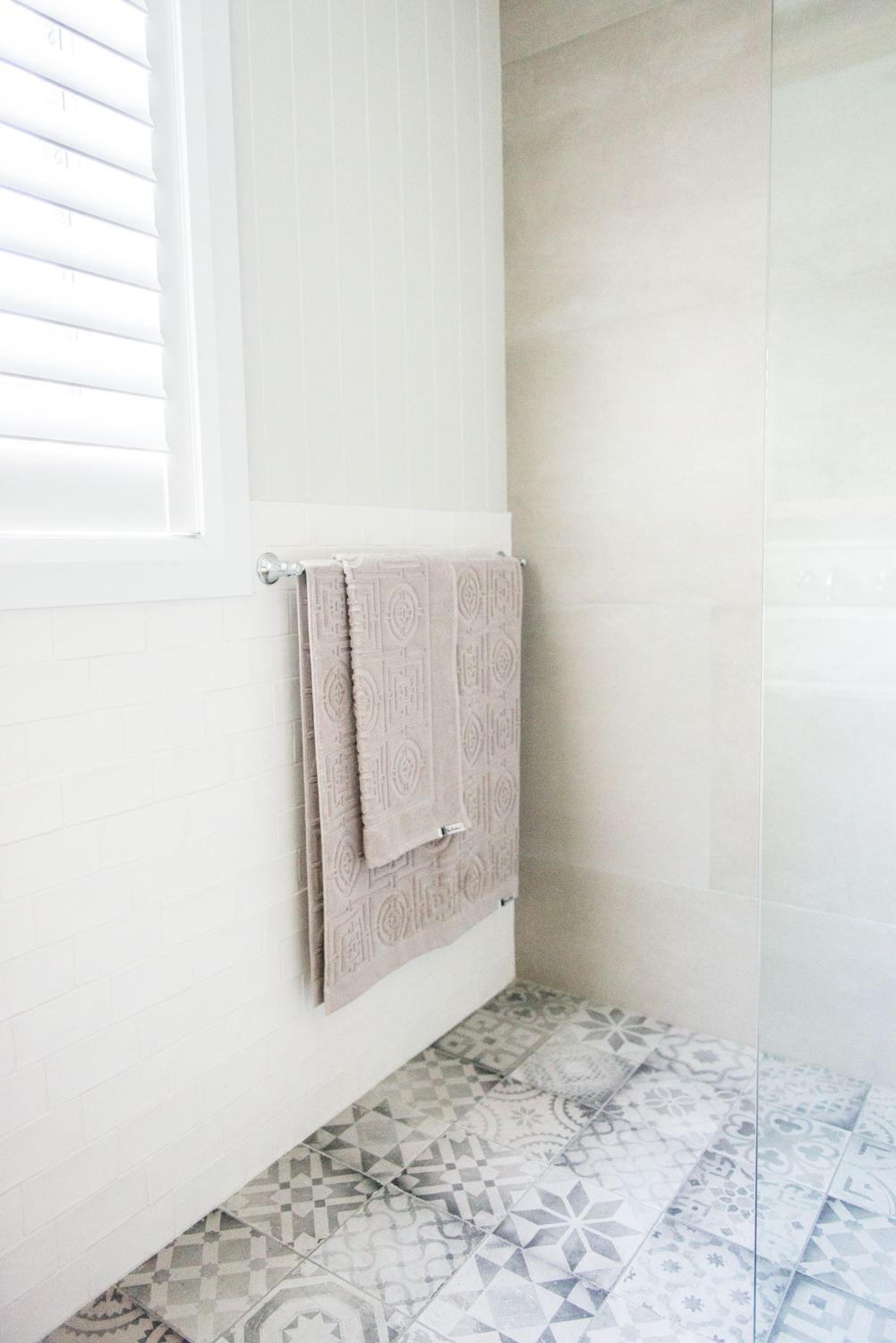 For the remaining walls (entry and shower walls) we’ve chosen a large format 600mm x 1200mm tile called ‘Esagona Ash’ – and it’s now one of my fav! You’ve got to love a large format tile in a shower area – as it means less grout to clean!