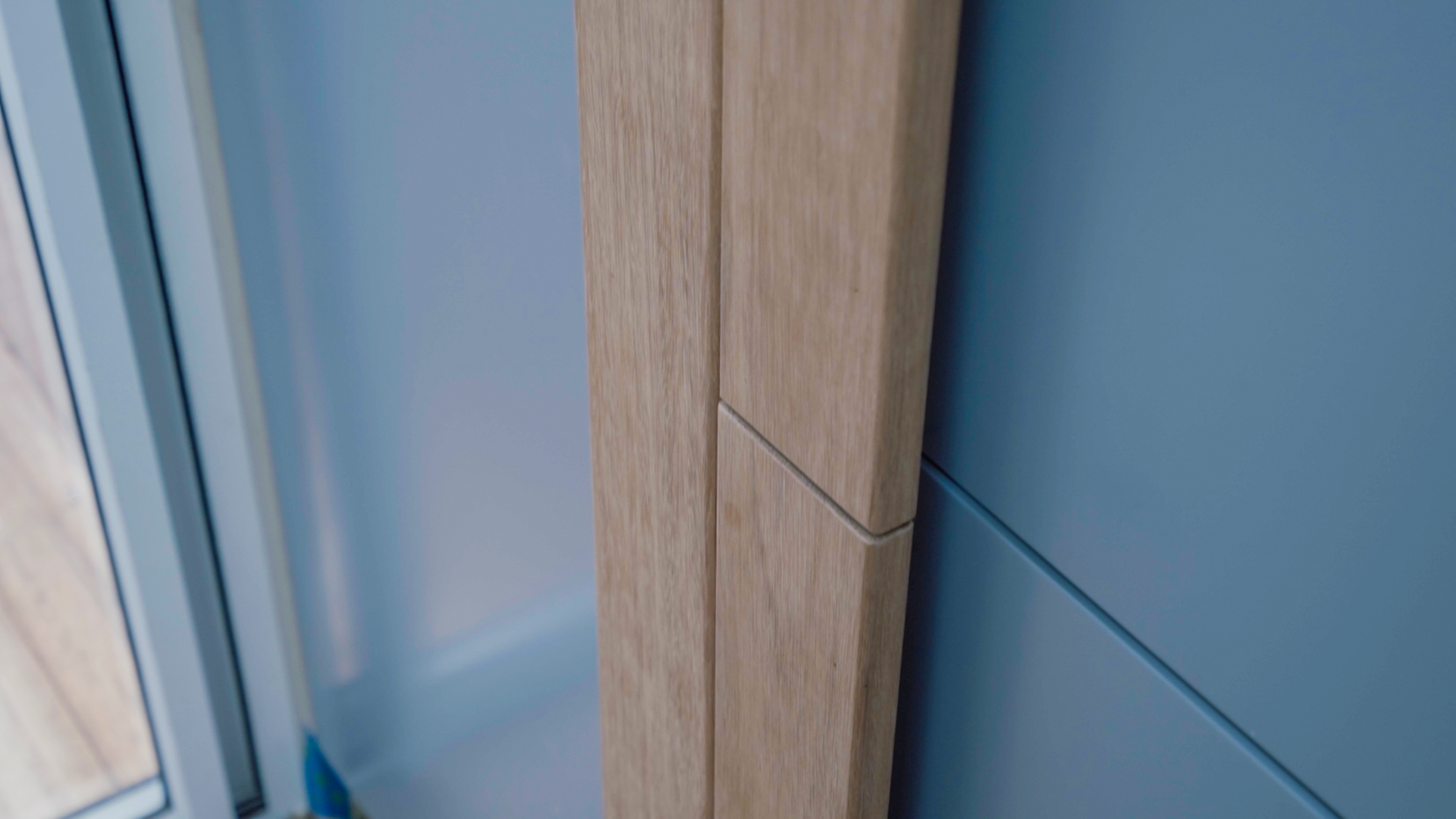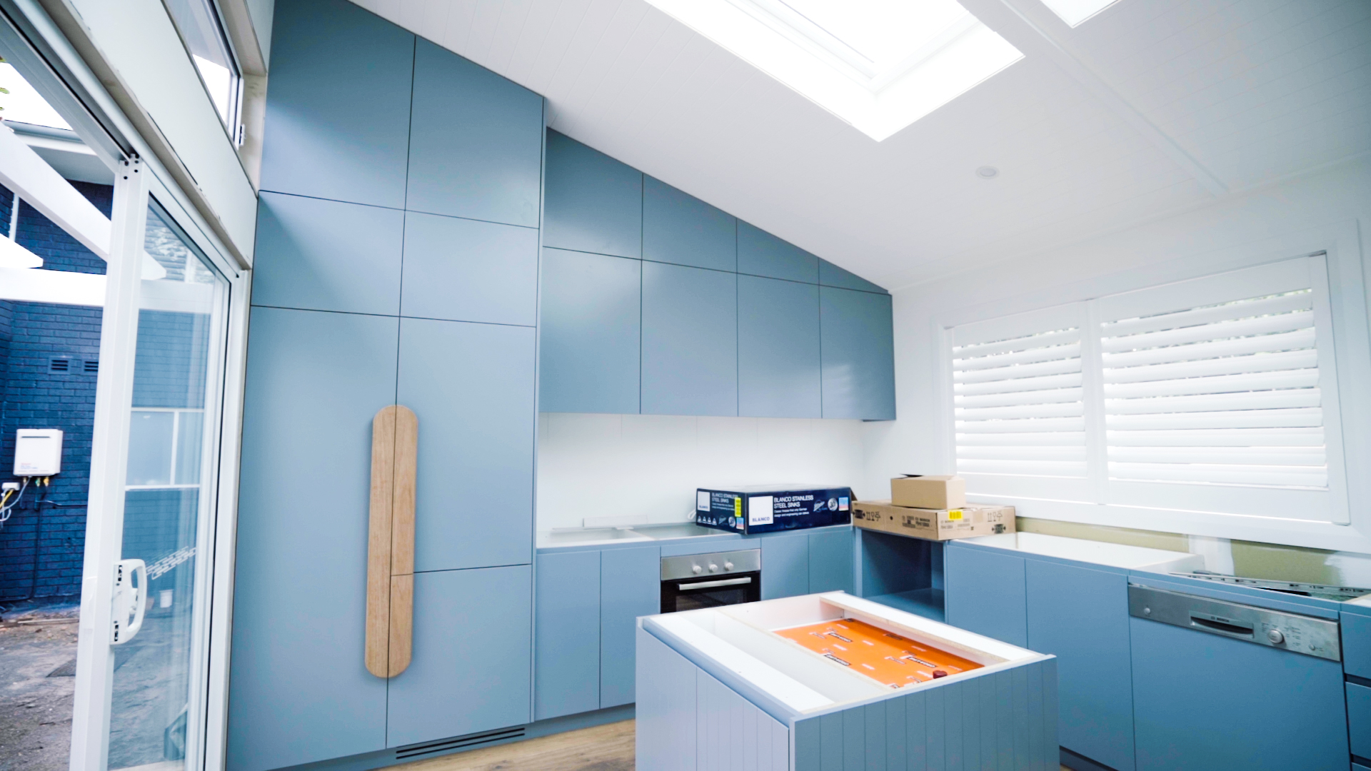 Moving back into the studio, things are progressing well! We’ve just had the kitchen cabinetry installed by Beachside Kitchens – eeekkkk getting so close! We’ve utilised every inch of that raked ceiling in this space – which means for a two-bedroom dwelling, the kitchen really provides amazing storage! We’ve chosen Taubmans ‘Iron Gate’ for the cabinetry colour, and Kyal and I have designed a custom handle for the Integrated fridge and pantry – somewhat surfboard inspired.