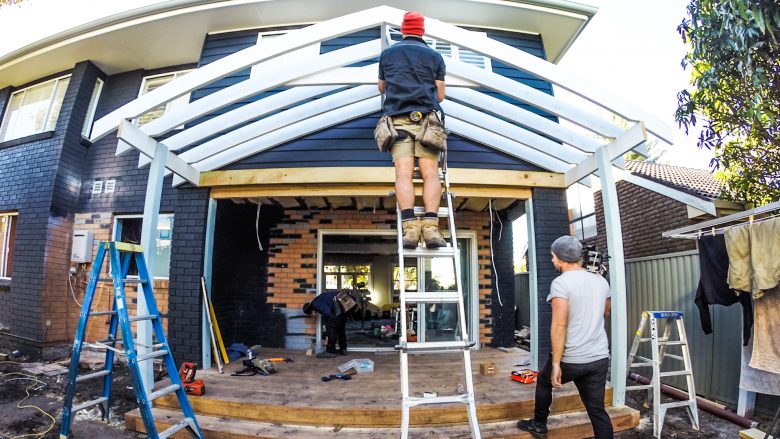 Our focus has once again shifted outside again as we’re working hard to tidy everything up out there. The rear of the house was looking flat and lacking dimension. We thought it would be a nice idea to build a rear pergola that we can grow some greenery over. Given that the rumpus room opens out onto this area, it will be a great place to relax in the summer months. Think plenty of greenery, hammocks and surfboards!