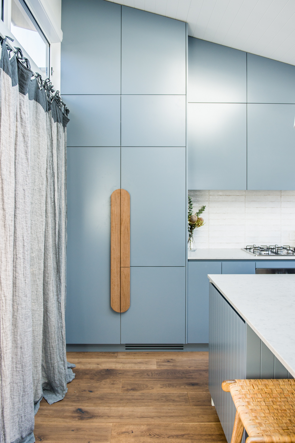 The finishing touches include Kyal’s custom made timber handles which open the fridge and pantry. It looks like we’re channeling a surfboard which I love as it’s the look we’re going for in this coastal space (without looking too cliche ‘surfy’). These beautiful drapes are ready made curtains from Hale Mercantile & Co.
