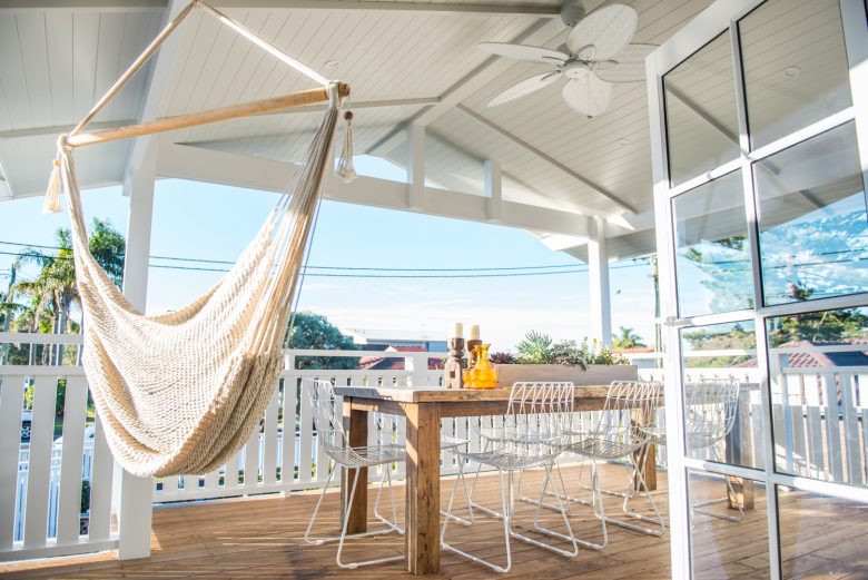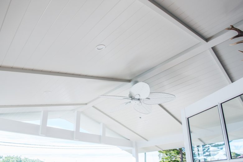 The ceilings have been lined with Easycraft Easyclad and painted with Taubmans Endure Exterior in ‘Surfmist’ – in keeping with all other eaves. Watch more of Wideline window and Easycraft installation at the front of house in Episode 4 – ‘Get your Mojo on’. Searching for exterior fans was a tough one but I found one I love. The ‘Tropical Windpointe Celing Fan’ with all-weather white blades is my exterior fan top pick! Ordered through MyFan.com.au – who were great to deal with and offered fast delivery.