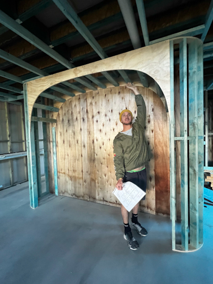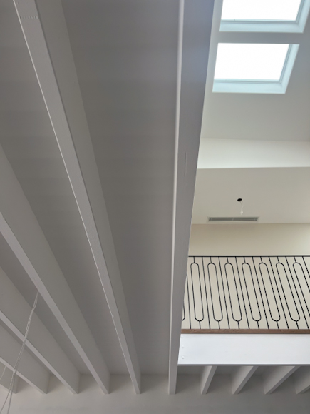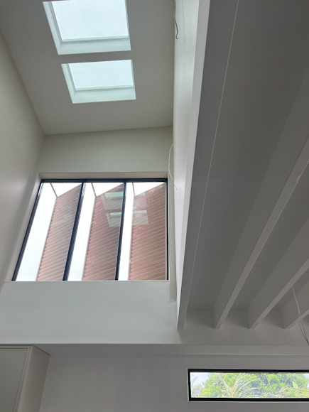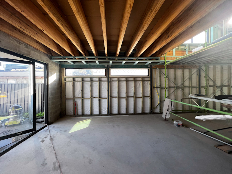 One of the first decisions we made in the living room was the inclusion of the Hyne Beams. Not only are they structural, but they’re also such a beautiful addition to the overall aesthetic. The plan was to paint House 1 beams white and stain the ones in House 2, however as the homes progressed we changed our mind on this and ended up painting them white in both homes. The next big decision in this space was deciding on the type of door we wanted to open out onto each backyard. We opted for the Wideline Paragon Bi-Fold doors so that opening them allows maximum free-flowing access between the indoor and outdoor living spaces.